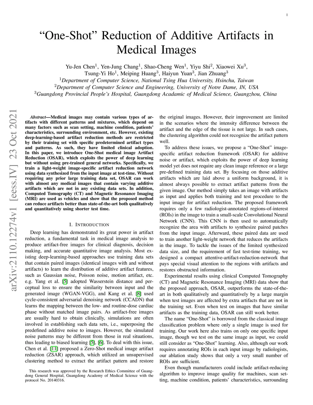 "One-Shot" Reduction of Additive Artifacts in Medical Images