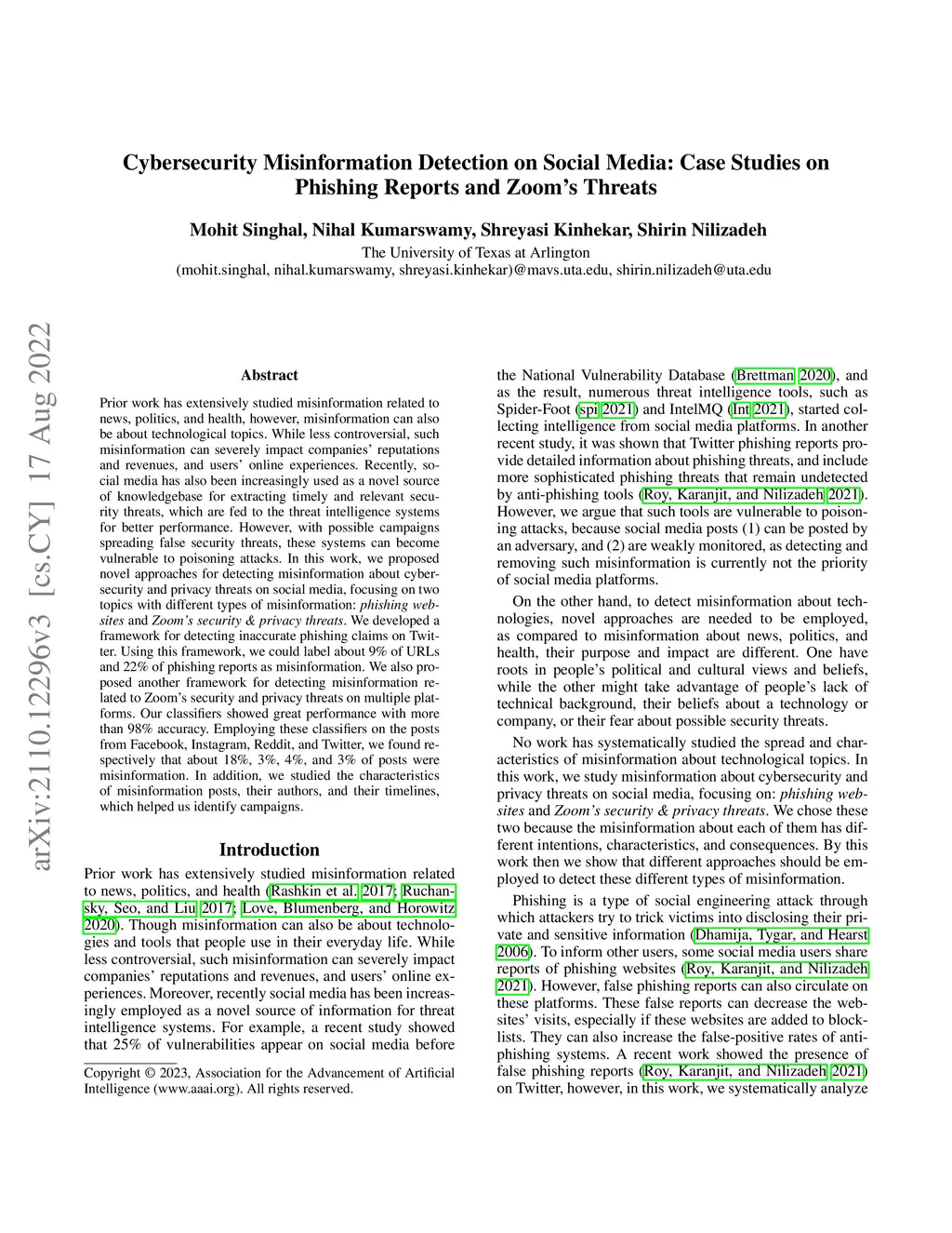 Prior work has extensively studied misinformation related to news, politics, and health, however, misinformation can also be about technological topics. While less controversial, such misinformation can severely impact companies' reputations and revenues, and users' online experiences. Recently, social media has also been increasingly used as a novel source of knowledgebase for extracting timely and relevant security threats, which are fed to the threat intelligence systems for better performance. However, with possible campaigns spreading false security threats, these systems can become vulnerable to poisoning attacks. In this work, we proposed novel approaches for detecting misinformation about cybersecurity and privacy threats on social media, focusing on two topics with different types of misinformation: phishing websites and Zoom's security & privacy threats. We developed a framework for detecting inaccurate phishing claims on Twitter. Using this framework, we could label about 9% of URLs and 22% of phishing reports as misinformation. We also proposed another framework for detecting misinformation related to Zoom's security and privacy threats on multiple platforms. Our classifiers showed great performance with more than 98% accuracy. Employing these classifiers on the posts from Facebook, Instagram, Reddit, and Twitter, we found respectively that about 18%, 3%, 4%, and 3% of posts were misinformation. In addition, we studied the characteristics of misinformation posts, their authors, and their timelines, which helped us identify campaigns.