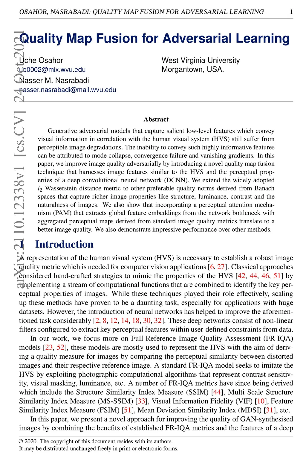 Generative adversarial models that capture salient low-level features which convey visual information in correlation with the human visual system (HVS) still suffer from perceptible image degradations. The inability to convey such highly informative features can be attributed to mode collapse, convergence failure and vanishing gradients. In this paper, we improve image quality adversarially by introducing a novel quality map fusion technique that harnesses image features similar to the HVS and the perceptual properties of a deep convolutional neural network (DCNN). We extend the widely adopted l2 Wasserstein distance metric to other preferable quality norms derived from Banach spaces that capture richer image properties like structure, luminance, contrast and the naturalness of images. We also show that incorporating a perceptual attention mechanism (PAM) that extracts global feature embeddings from the network bottleneck with aggregated perceptual maps derived from standard image quality metrics translate to a better image quality. We also demonstrate impressive performance over other methods.
