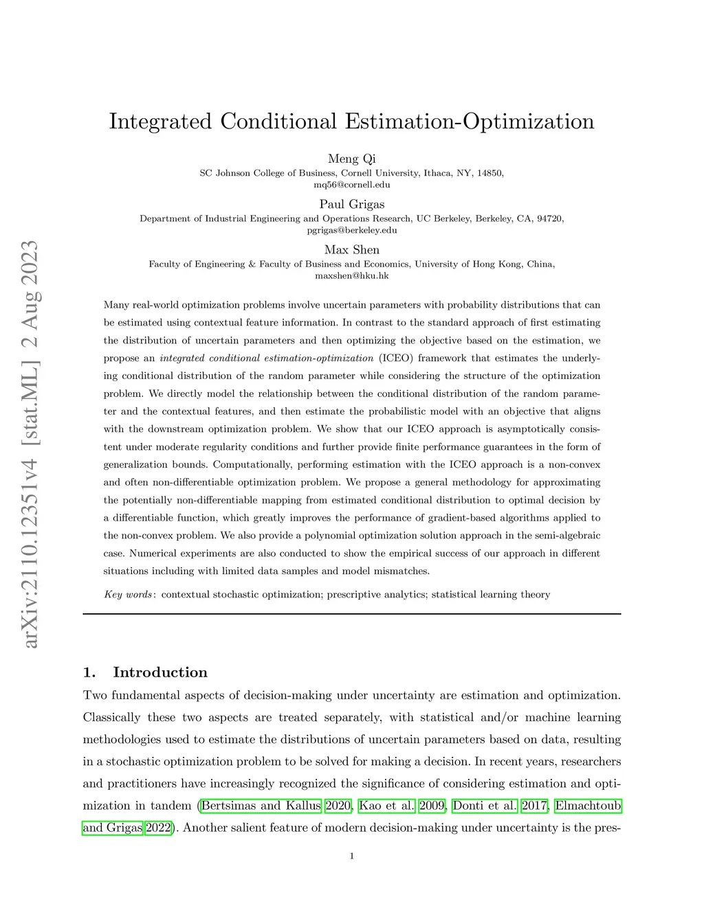 Many real-world optimization problems involve uncertain parameters with probability distributions that can be estimated using contextual feature information. In contrast to the standard approach of first estimating the distribution of uncertain parameters and then optimizing the objective based on the estimation, we propose an integrated conditional estimation-optimization (ICEO) framework that estimates the underlying conditional distribution of the random parameter while considering the structure of the optimization problem. We directly model the relationship between the conditional distribution of the random parameter and the contextual features, and then estimate the probabilistic model with an objective that aligns with the downstream optimization problem. We show that our ICEO approach is asymptotically consistent under moderate regularity conditions and further provide finite performance guarantees in the form of generalization bounds. Computationally, performing estimation with the ICEO approach is a non-convex and often non-differentiable optimization problem. We propose a general methodology for approximating the potentially non-differentiable mapping from estimated conditional distribution to the optimal decision by a differentiable function, which greatly improves the performance of gradient-based algorithms applied to the non-convex problem. We also provide a polynomial optimization solution approach in the semi-algebraic case. Numerical experiments are also conducted to show the empirical success of our approach in different situations including with limited data samples and model mismatches.
