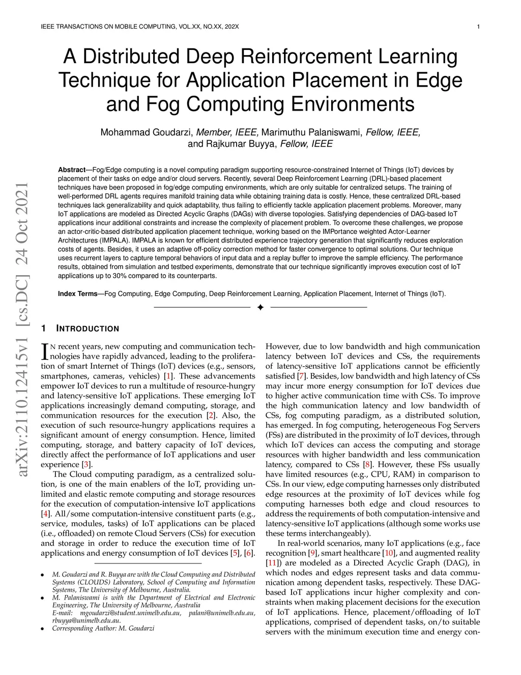 Fog/Edge computing is a novel computing paradigm supporting resource-constrained Internet of Things (IoT) devices by the placement of their tasks on the edge and/or cloud servers. Recently, several Deep Reinforcement Learning (DRL)-based placement techniques have been proposed in fog/edge computing environments, which are only suitable for centralized setups. The training of well-performed DRL agents requires manifold training data while obtaining training data is costly. Hence, these centralized DRL-based techniques lack generalizability and quick adaptability, thus failing to efficiently tackle application placement problems. Moreover, many IoT applications are modeled as Directed Acyclic Graphs (DAGs) with diverse topologies. Satisfying dependencies of DAG-based IoT applications incur additional constraints and increase the complexity of placement problems. To overcome these challenges, we propose an actor-critic-based distributed application placement technique, working based on the IMPortance weighted Actor-Learner Architectures (IMPALA). IMPALA is known for efficient distributed experience trajectory generation that significantly reduces the exploration costs of agents. Besides, it uses an adaptive off-policy correction method for faster convergence to optimal solutions. Our technique uses recurrent layers to capture temporal behaviors of input data and a replay buffer to improve the sample efficiency. The performance results, obtained from simulation and testbed experiments, demonstrate that our technique significantly improves the execution cost of IoT applications up to 30\% compared to its counterparts.