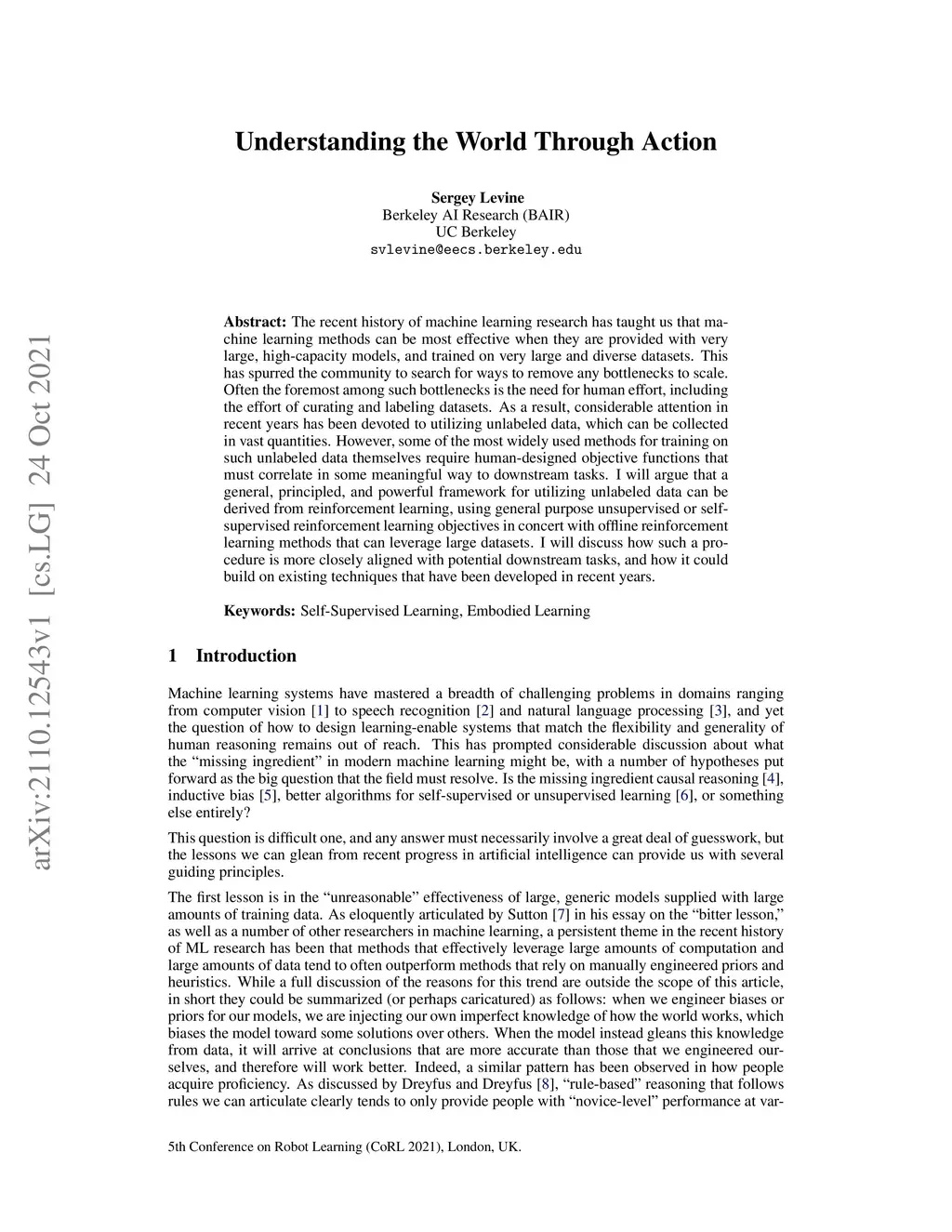 The recent history of machine learning research has taught us that machine learning methods can be most effective when they are provided with very large, high-capacity models, and trained on very large and diverse datasets. This has spurred the community to search for ways to remove any bottlenecks to scale. Often the foremost among such bottlenecks is the need for human effort, including the effort of curating and labeling datasets. As a result, considerable attention in recent years has been devoted to utilizing unlabeled data, which can be collected in vast quantities. However, some of the most widely used methods for training on such unlabeled data themselves require human-designed objective functions that must correlate in some meaningful way to downstream tasks. I will argue that a general, principled, and powerful framework for utilizing unlabeled data can be derived from reinforcement learning, using general purpose unsupervised or self-supervised reinforcement learning objectives in concert with offline reinforcement learning methods that can leverage large datasets. I will discuss how such a procedure is more closely aligned with potential downstream tasks, and how it could build on existing techniques that have been developed in recent years.