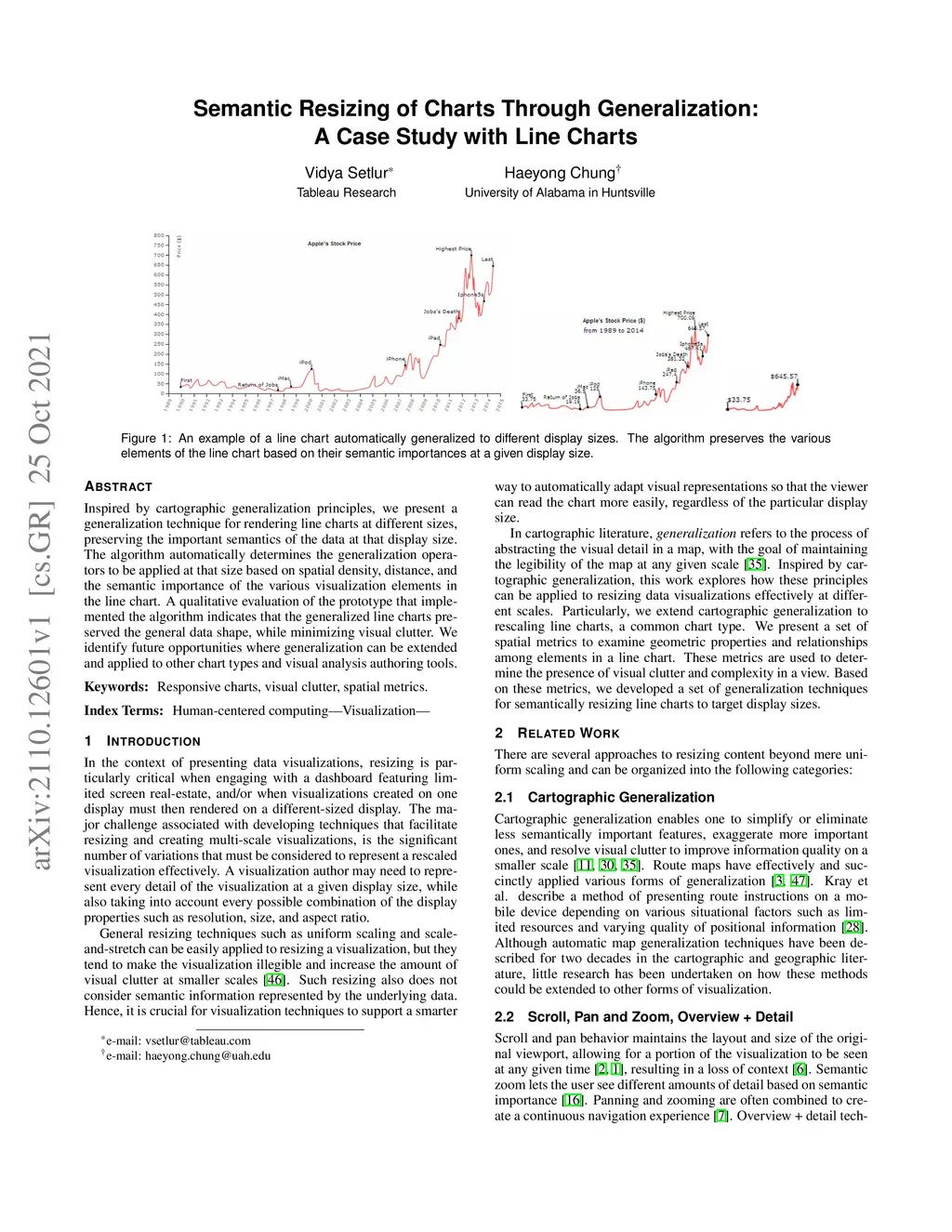 Inspired by cartographic generalization principles, we present a generalization technique for rendering line charts at different sizes, preserving the important semantics of the data at that display size. The algorithm automatically determines the generalization operators to be applied at that size based on spatial density, distance, and the semantic importance of the various visualization elements in the line chart. A qualitative evaluation of the prototype that implemented the algorithm indicates that the generalized line charts pre-served the general data shape, while minimizing visual clutter. We identify future opportunities where generalization can be extended and applied to other chart types and visual analysis authoring tools.