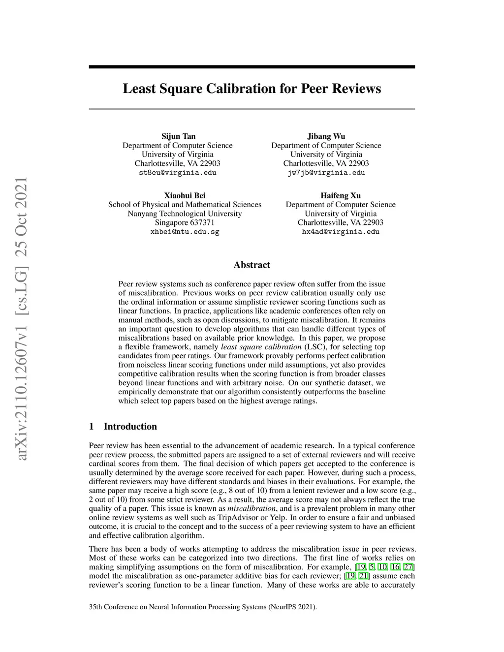 Peer review systems such as conference paper review often suffer from the issue of miscalibration. Previous works on peer review calibration usually only use the ordinal information or assume simplistic reviewer scoring functions such as linear functions. In practice, applications like academic conferences often rely on manual methods, such as open discussions, to mitigate miscalibration. It remains an important question to develop algorithms that can handle different types of miscalibrations based on available prior knowledge. In this paper, we propose a flexible framework, namely least square calibration (LSC), for selecting top candidates from peer ratings. Our framework provably performs perfect calibration from noiseless linear scoring functions under mild assumptions, yet also provides competitive calibration results when the scoring function is from broader classes beyond linear functions and with arbitrary noise. On our synthetic dataset, we empirically demonstrate that our algorithm consistently outperforms the baseline which select top papers based on the highest average ratings.