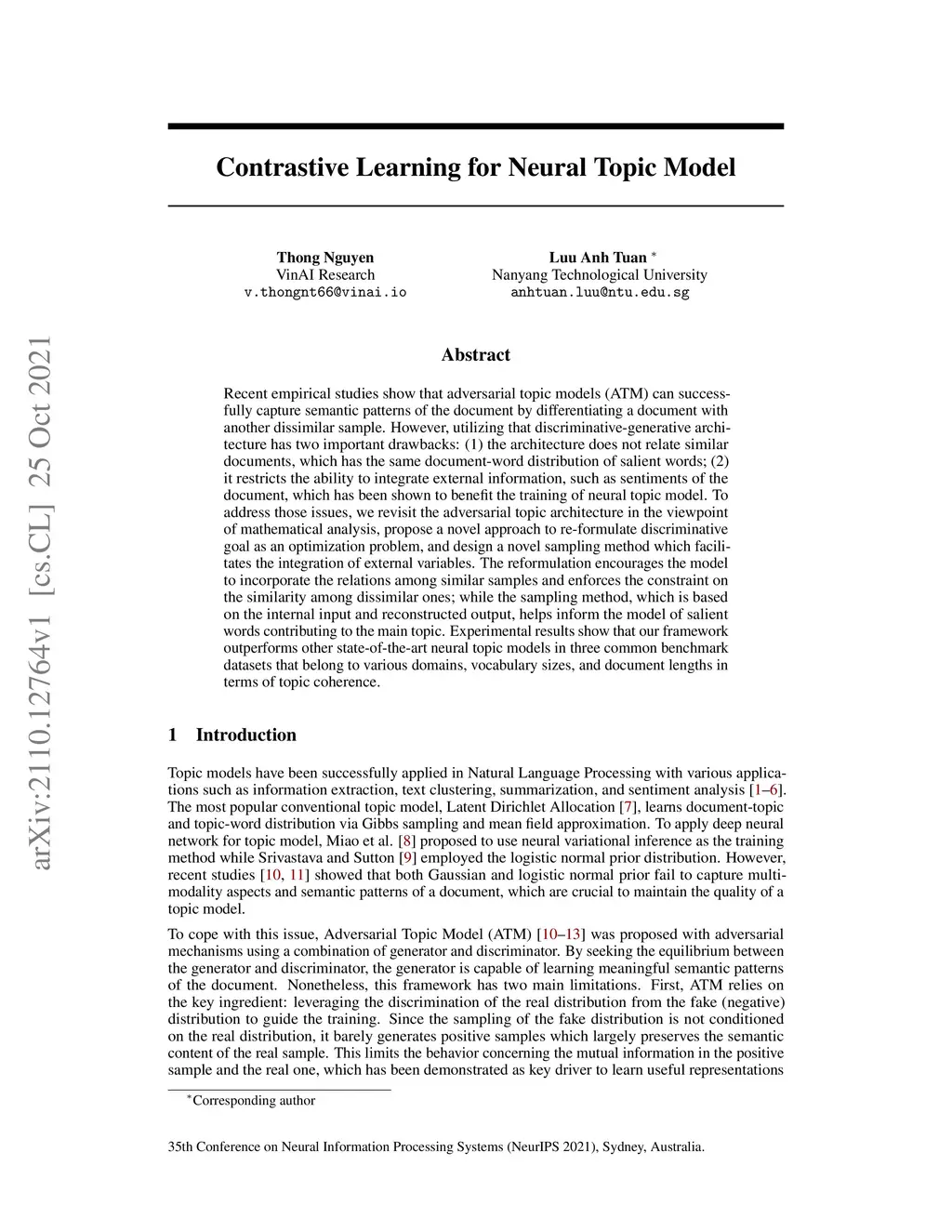 Contrastive Learning for Neural Topic Model