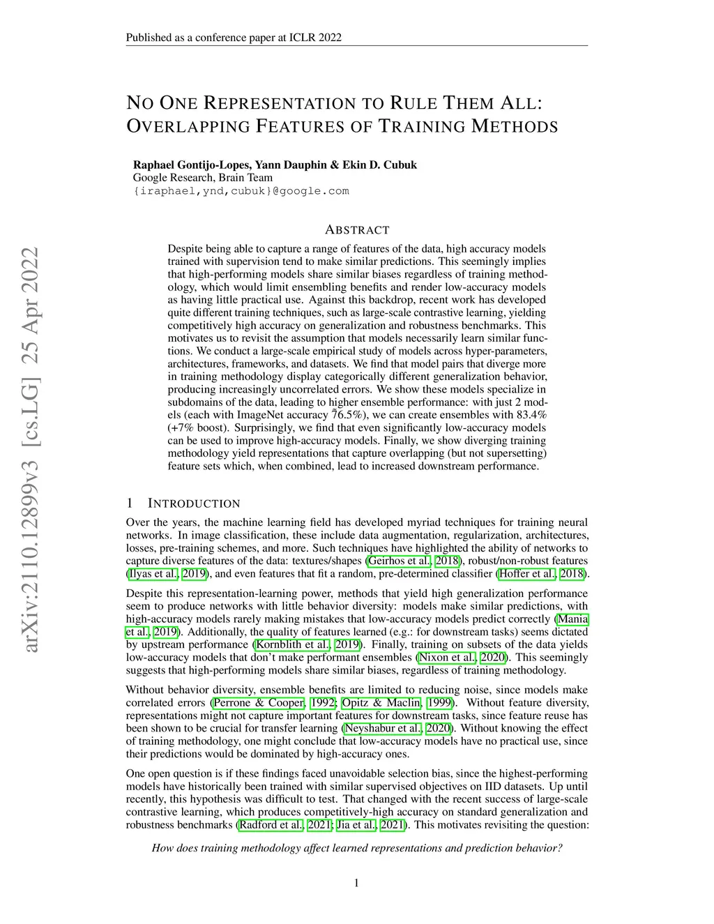 Despite being able to capture a range of features of the data, high accuracy models trained with supervision tend to make similar predictions. This seemingly implies that high-performing models share similar biases regardless of training methodology, which would limit ensembling benefits and render low-accuracy models as having little practical use. Against this backdrop, recent work has developed quite different training techniques, such as large-scale contrastive learning, yielding competitively high accuracy on generalization and robustness benchmarks. This motivates us to revisit the assumption that models necessarily learn similar functions. We conduct a large-scale empirical study of models across hyper-parameters, architectures, frameworks, and datasets. We find that model pairs that diverge more in training methodology display categorically different generalization behavior, producing increasingly uncorrelated errors. We show these models specialize in subdomains of the data, leading to higher ensemble performance: with just 2 models (each with ImageNet accuracy ~76.5%), we can create ensembles with 83.4% (+7% boost). Surprisingly, we find that even significantly low-accuracy models can be used to improve high-accuracy models. Finally, we show diverging training methodology yield representations that capture overlapping (but not supersetting) feature sets which, when combined, lead to increased downstream performance.