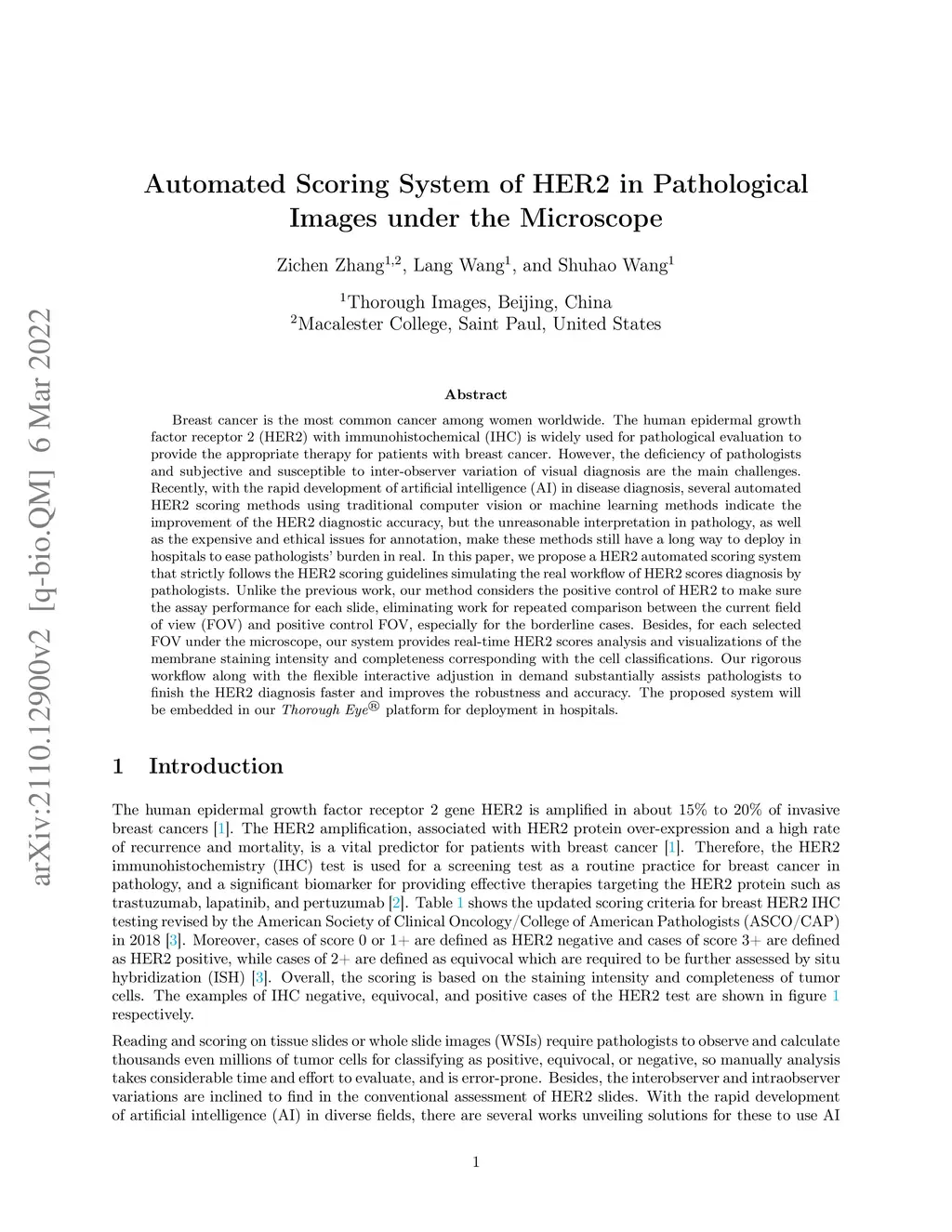 Automated Scoring System of HER2 in Pathological Images under the