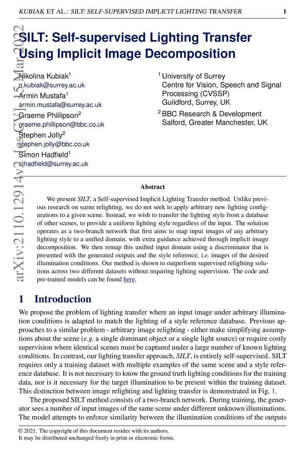 We present SILT, a Self-supervised Implicit Lighting Transfer method. Unlike previous research on scene relighting, we do not seek to apply arbitrary new lighting configurations to a given scene. Instead, we wish to transfer the lighting style from a database of other scenes, to provide a uniform lighting style regardless of the input. The solution operates as a two-branch network that first aims to map input images of any arbitrary lighting style to a unified domain, with extra guidance achieved through implicit image decomposition. We then remap this unified input domain using a discriminator that is presented with the generated outputs and the style reference, i.e. images of the desired illumination conditions. Our method is shown to outperform supervised relighting solutions across two different datasets without requiring lighting supervision.