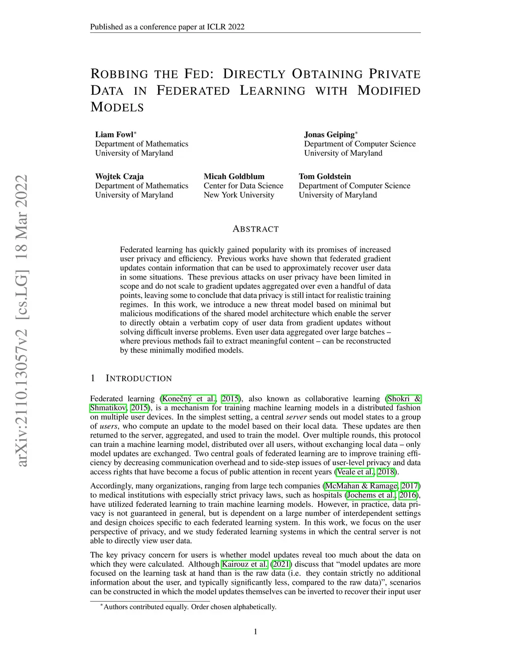 Federated learning has quickly gained popularity with its promises of increased user privacy and efficiency. Previous works have shown that federated gradient updates contain information that can be used to approximately recover user data in some situations. These previous attacks on user privacy have been limited in scope and do not scale to gradient updates aggregated over even a handful of data points, leaving some to conclude that data privacy is still intact for realistic training regimes. In this work, we introduce a new threat model based on minimal but malicious modifications of the shared model architecture which enable the server to directly obtain a verbatim copy of user data from gradient updates without solving difficult inverse problems. Even user data aggregated over large batches -- where previous methods fail to extract meaningful content -- can be reconstructed by these minimally modified models.