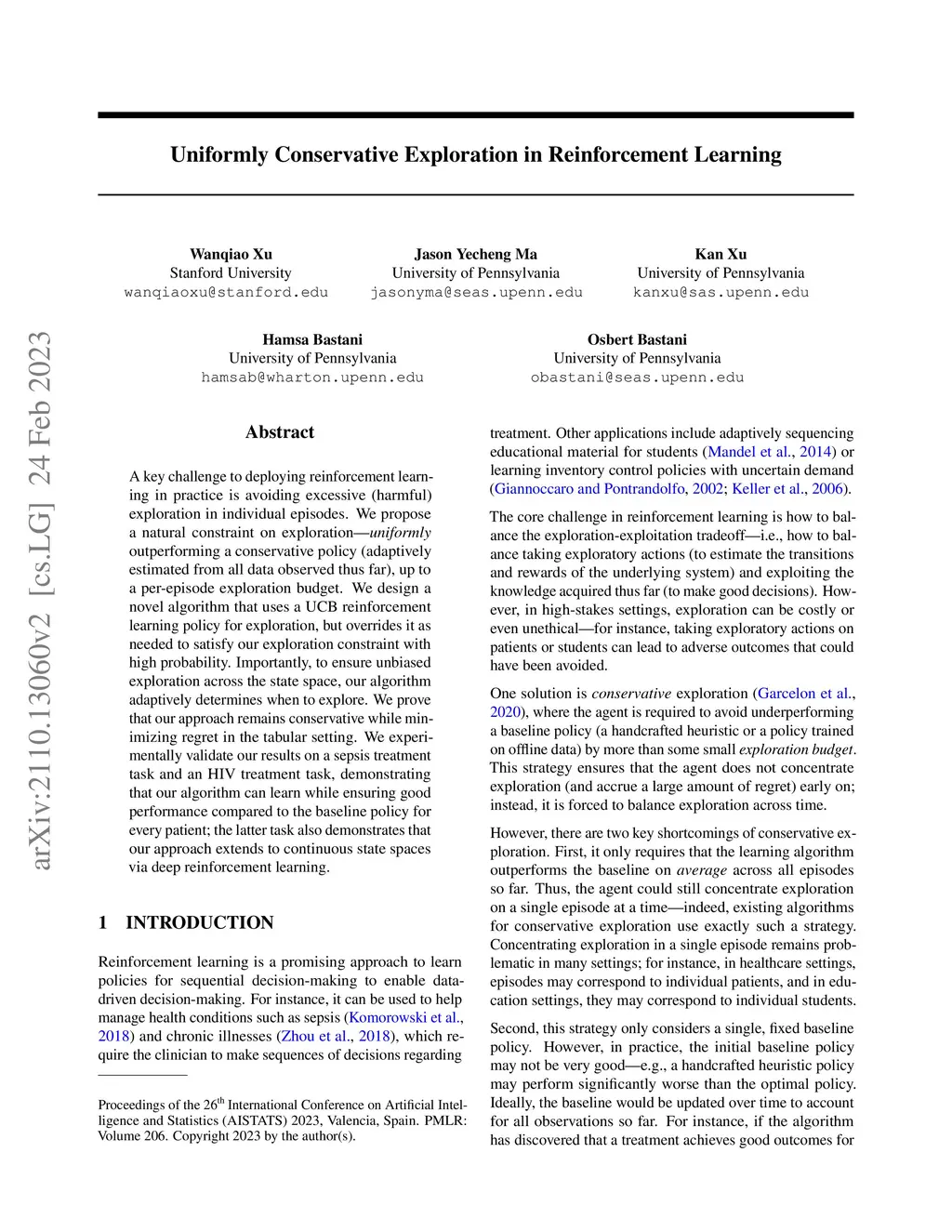 A key challenge to deploying reinforcement learning in practice is avoiding excessive (harmful) exploration in individual episodes. We propose a natural constraint on exploration -- \textit{uniformly} outperforming a conservative policy (adaptively estimated from all data observed thus far), up to a per-episode exploration budget. We design a novel algorithm that uses a UCB reinforcement learning policy for exploration, but overrides it as needed to satisfy our exploration constraint with high probability. Importantly, to ensure unbiased exploration across the state space, our algorithm adaptively determines when to explore. We prove that our approach remains conservative while minimizing regret in the tabular setting. We experimentally validate our results on a sepsis treatment task and an HIV treatment task, demonstrating that our algorithm can learn while ensuring good performance compared to the baseline policy for every patient; the latter task also demonstrates that our approach extends to continuous state spaces via deep reinforcement learning.