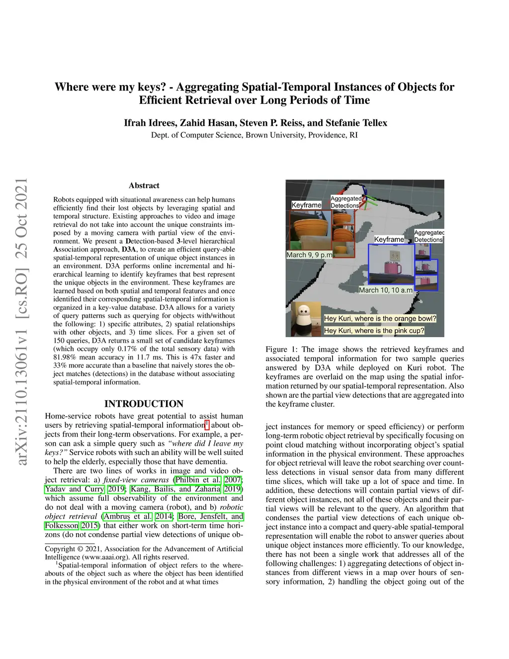 Robots equipped with situational awareness can help humans efficiently find their lost objects by leveraging spatial and temporal structure. Existing approaches to video and image retrieval do not take into account the unique constraints imposed by a moving camera with a partial view of the environment. We present a Detection-based 3-level hierarchical Association approach, D3A, to create an efficient query-able spatial-temporal representation of unique object instances in an environment. D3A performs online incremental and hierarchical learning to identify keyframes that best represent the unique objects in the environment. These keyframes are learned based on both spatial and temporal features and once identified their corresponding spatial-temporal information is organized in a key-value database. D3A allows for a variety of query patterns such as querying for objects with/without the following: 1) specific attributes, 2) spatial relationships with other objects, and 3) time slices. For a given set of 150 queries, D3A returns a small set of candidate keyframes (which occupy only 0.17% of the total sensory data) with 81.98\% mean accuracy in 11.7 ms. This is 47x faster and 33% more accurate than a baseline that naively stores the object matches (detections) in the database without associating spatial-temporal information.