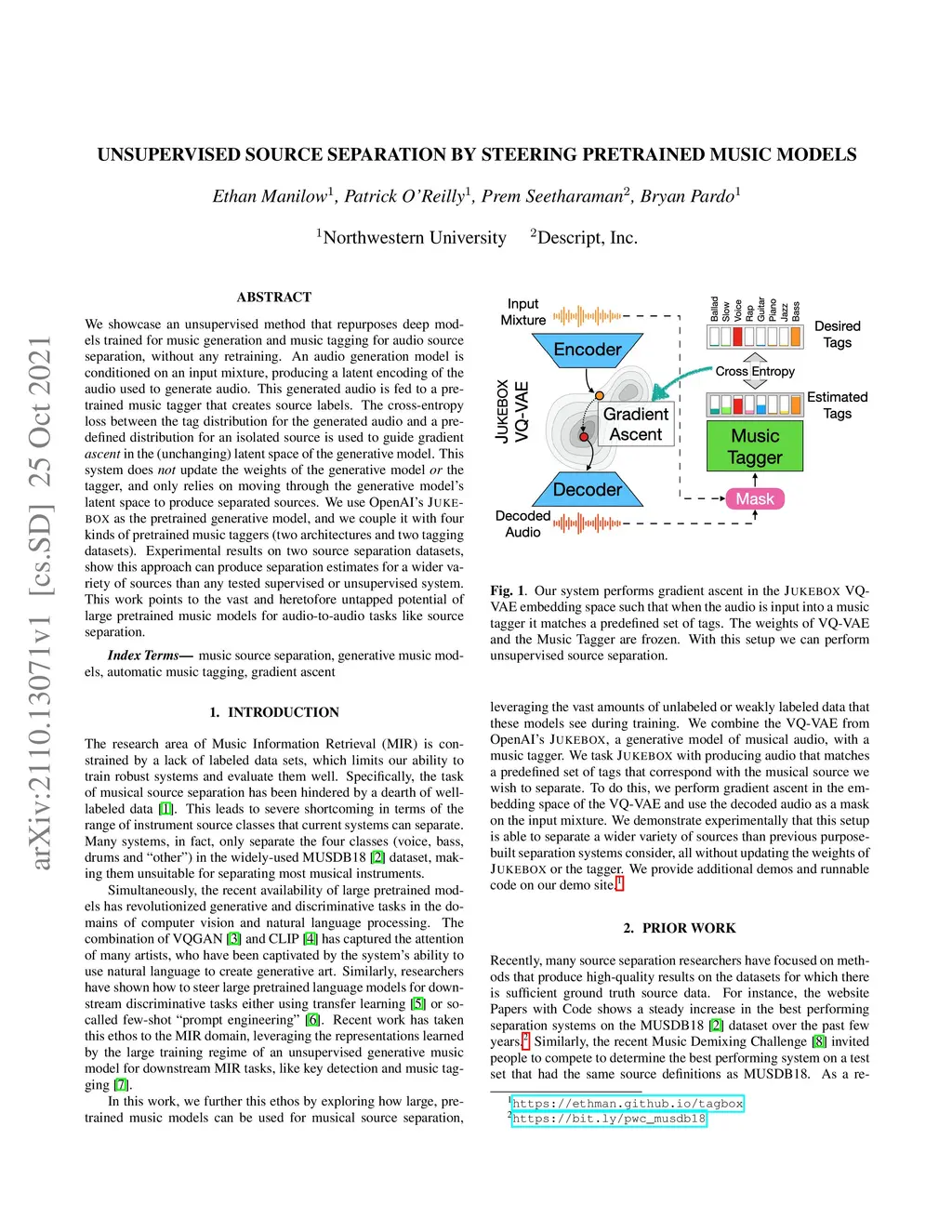 We showcase an unsupervised method that repurposes deep models trained for music generation and music tagging for audio source separation, without any retraining. An audio generation model is conditioned on an input mixture, producing a latent encoding of the audio used to generate audio. This generated audio is fed to a pretrained music tagger that creates source labels. The cross-entropy loss between the tag distribution for the generated audio and a predefined distribution for an isolated source is used to guide gradient ascent in the (unchanging) latent space of the generative model. This system does not update the weights of the generative model or the tagger, and only relies on moving through the generative model's latent space to produce separated sources. We use OpenAI's Jukebox as the pretrained generative model, and we couple it with four kinds of pretrained music taggers (two architectures and two tagging datasets). Experimental results on two source separation datasets, show this approach can produce separation estimates for a wider variety of sources than any tested supervised or unsupervised system. This work points to the vast and heretofore untapped potential of large pretrained music models for audio-to-audio tasks like source separation.