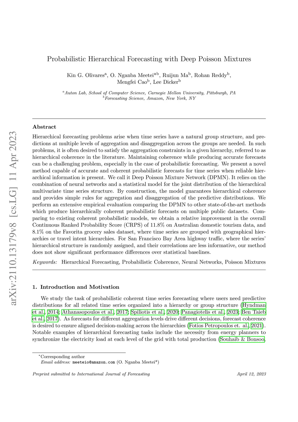 Hierarchical forecasting problems arise when time series have a natural group structure, and predictions at multiple levels of aggregation and disaggregation across the groups are needed. In such problems, it is often desired to satisfy the aggregation constraints in a given hierarchy, referred to as hierarchical coherence in the literature. Maintaining coherence while producing accurate forecasts can be a challenging problem, especially in the case of probabilistic forecasting. We present a novel method capable of accurate and coherent probabilistic forecasts for time series when reliable hierarchical information is present. We call it Deep Poisson Mixture Network (DPMN). It relies on the combination of neural networks and a statistical model for the joint distribution of the hierarchical multivariate time series structure. By construction, the model guarantees hierarchical coherence and provides simple rules for aggregation and disaggregation of the predictive distributions. We perform an extensive empirical evaluation comparing the DPMN to other state-of-the-art methods which produce hierarchically coherent probabilistic forecasts on multiple public datasets. Comparing to existing coherent probabilistic models, we obtain a relative improvement in the overall Continuous Ranked Probability Score (CRPS) of 11.8% on Australian domestic tourism data, and 8.1% on the Favorita grocery sales dataset, where time series are grouped with geographical hierarchies or travel intent hierarchies. For San Francisco Bay Area highway traffic, where the series' hierarchical structure is randomly assigned, and their correlations are less informative, our method does not show significant performance differences over statistical baselines.