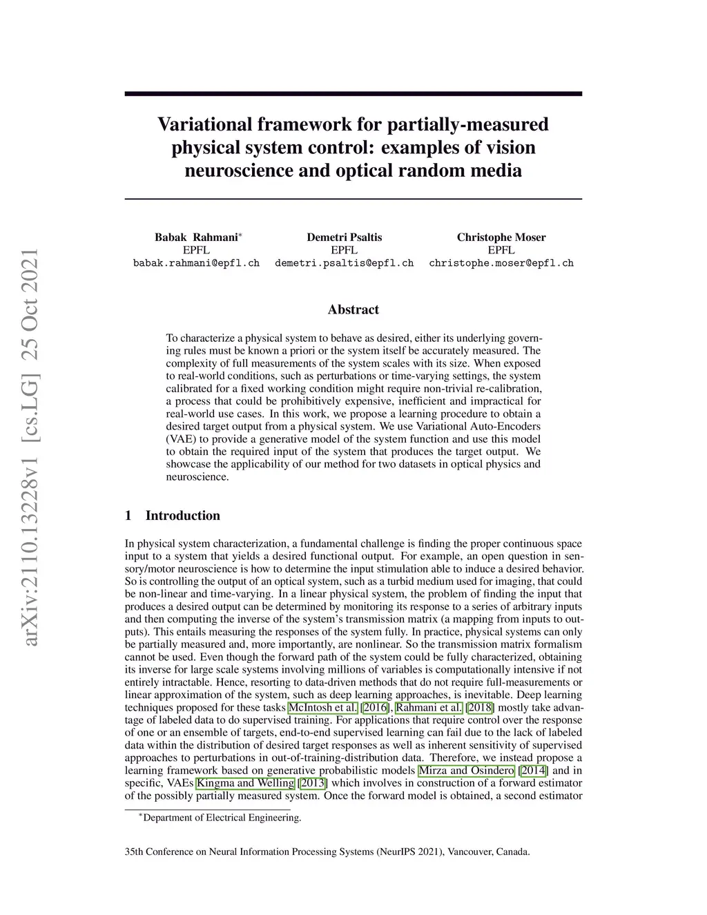To characterize a physical system to behave as desired, either its underlying governing rules must be known a priori or the system itself be accurately measured. The complexity of full measurements of the system scales with its size. When exposed to real-world conditions, such as perturbations or time-varying settings, the system calibrated for a fixed working condition might require non-trivial re-calibration, a process that could be prohibitively expensive, inefficient and impractical for real-world use cases. In this work, we propose a learning procedure to obtain a desired target output from a physical system. We use Variational Auto-Encoders (VAE) to provide a generative model of the system function and use this model to obtain the required input of the system that produces the target output. We showcase the applicability of our method for two datasets in optical physics and neuroscience.