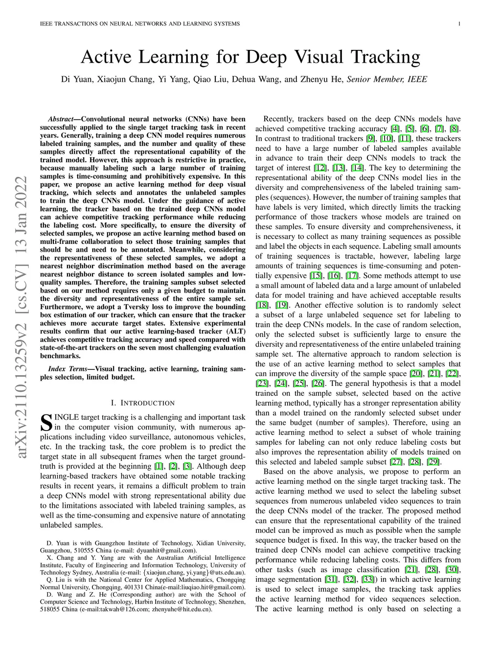 Convolutional neural networks (CNNs) have been successfully applied to the single target tracking task in recent years. Generally, training a deep CNN model requires numerous labeled training samples, and the number and quality of these samples directly affect the representational capability of the trained model. However, this approach is restrictive in practice, because manually labeling such a large number of training samples is time-consuming and prohibitively expensive. In this paper, we propose an active learning method for deep visual tracking, which selects and annotates the unlabeled samples to train the deep CNNs model. Under the guidance of active learning, the tracker based on the trained deep CNNs model can achieve competitive tracking performance while reducing the labeling cost. More specifically, to ensure the diversity of selected samples, we propose an active learning method based on multi-frame collaboration to select those training samples that should be and need to be annotated. Meanwhile, considering the representativeness of these selected samples, we adopt a nearest neighbor discrimination method based on the average nearest neighbor distance to screen isolated samples and low-quality samples. Therefore, the training samples subset selected based on our method requires only a given budget to maintain the diversity and representativeness of the entire sample set. Furthermore, we adopt a Tversky loss to improve the bounding box estimation of our tracker, which can ensure that the tracker achieves more accurate target states. Extensive experimental results confirm that our active learning-based tracker (ALT) achieves competitive tracking accuracy and speed compared with state-of-the-art trackers on the seven most challenging evaluation benchmarks.