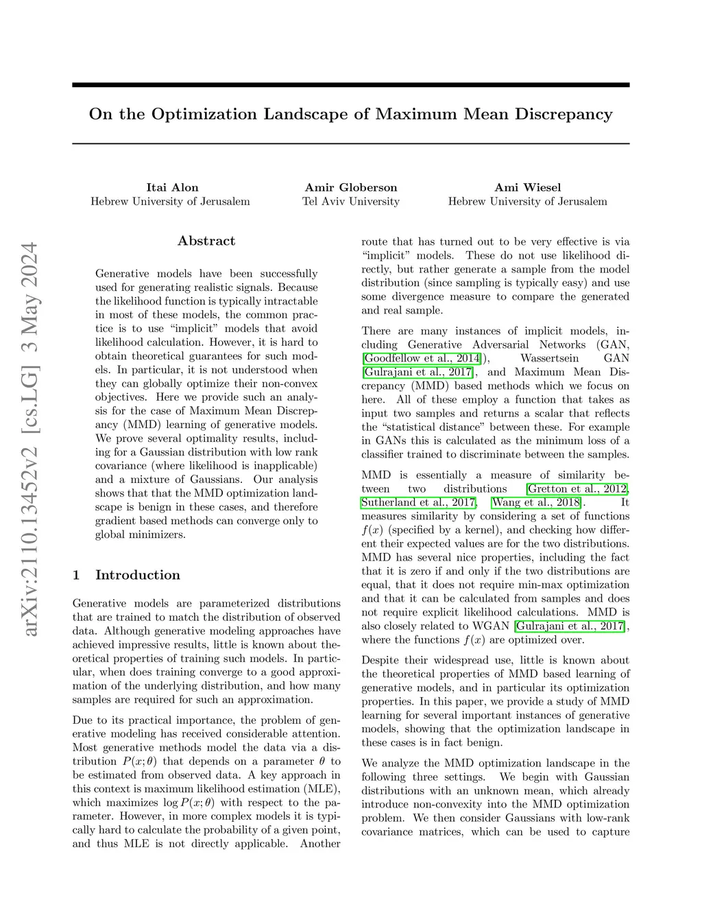Generative models have been successfully used for generating realistic signals. Because the likelihood function is typically intractable in most of these models, the common practice is to use "implicit" models that avoid likelihood calculation. However, it is hard to obtain theoretical guarantees for such models. In particular, it is not understood when they can globally optimize their non-convex objectives. Here we provide such an analysis for the case of Maximum Mean Discrepancy (MMD) learning of generative models. We prove several optimality results, including for a Gaussian distribution with low rank covariance (where likelihood is inapplicable) and a mixture of Gaussians. Our analysis shows that that the MMD optimization landscape is benign in these cases, and therefore gradient based methods will globally minimize the MMD objective.