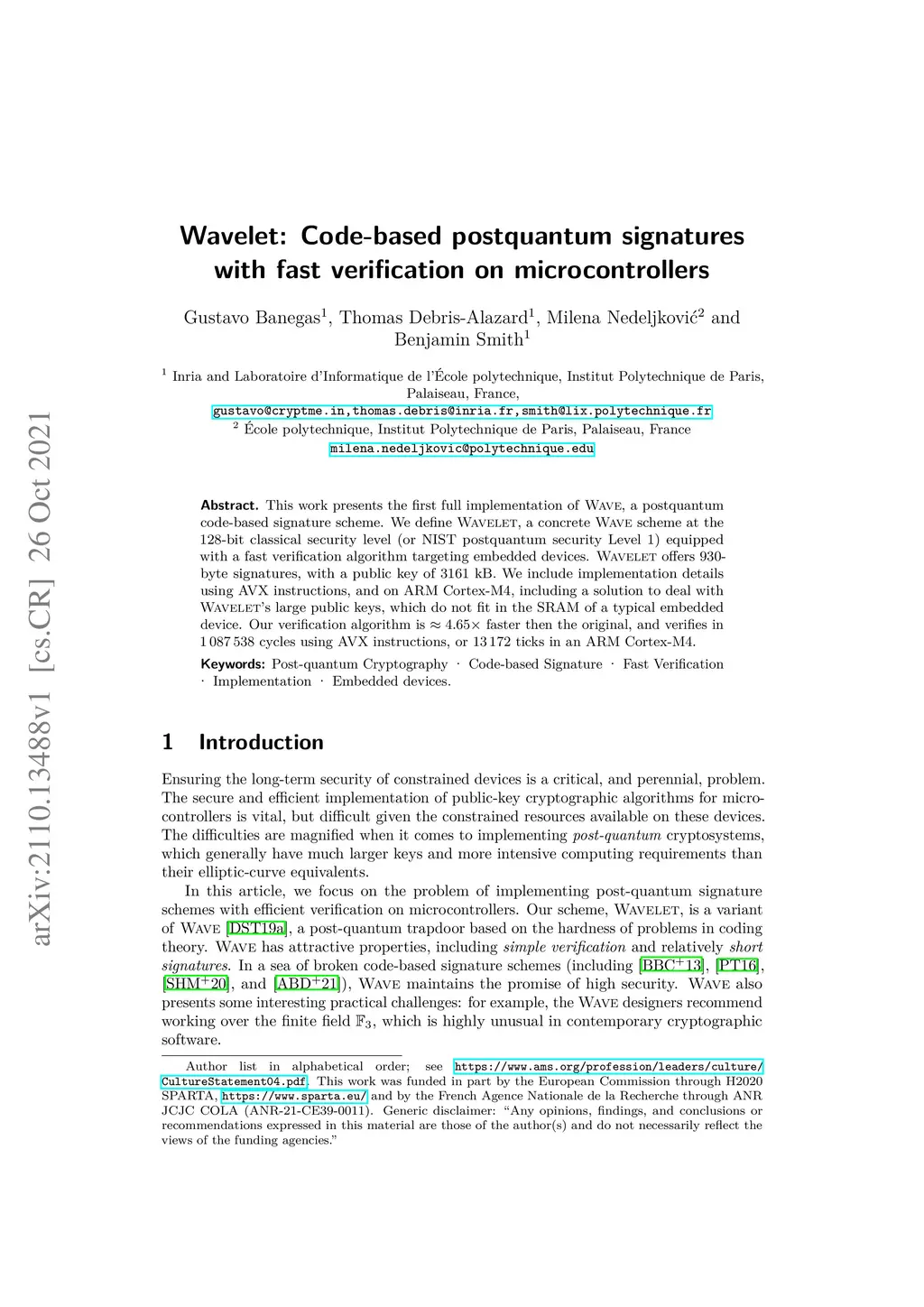 This work presents the first full implementation of Wave, a postquantum code-based signature scheme. We define Wavelet, a concrete Wave scheme at the 128-bit classical security level (or NIST postquantum security Level 1) equipped with a fast verification algorithm targeting embedded devices. Wavelet offers 930-byte signatures, with a public key of 3161 kB. We include implementation details using AVX instructions, and on ARM Cortex-M4, including a solution to deal with Wavelet's large public keys, which do not fit in the SRAM of a typical embedded device. Our verification algorithm is faster then the original, and verifies in 1 087 538 cycles using AVX instructions, or 13 172 ticks in an ARM Cortex-M4.