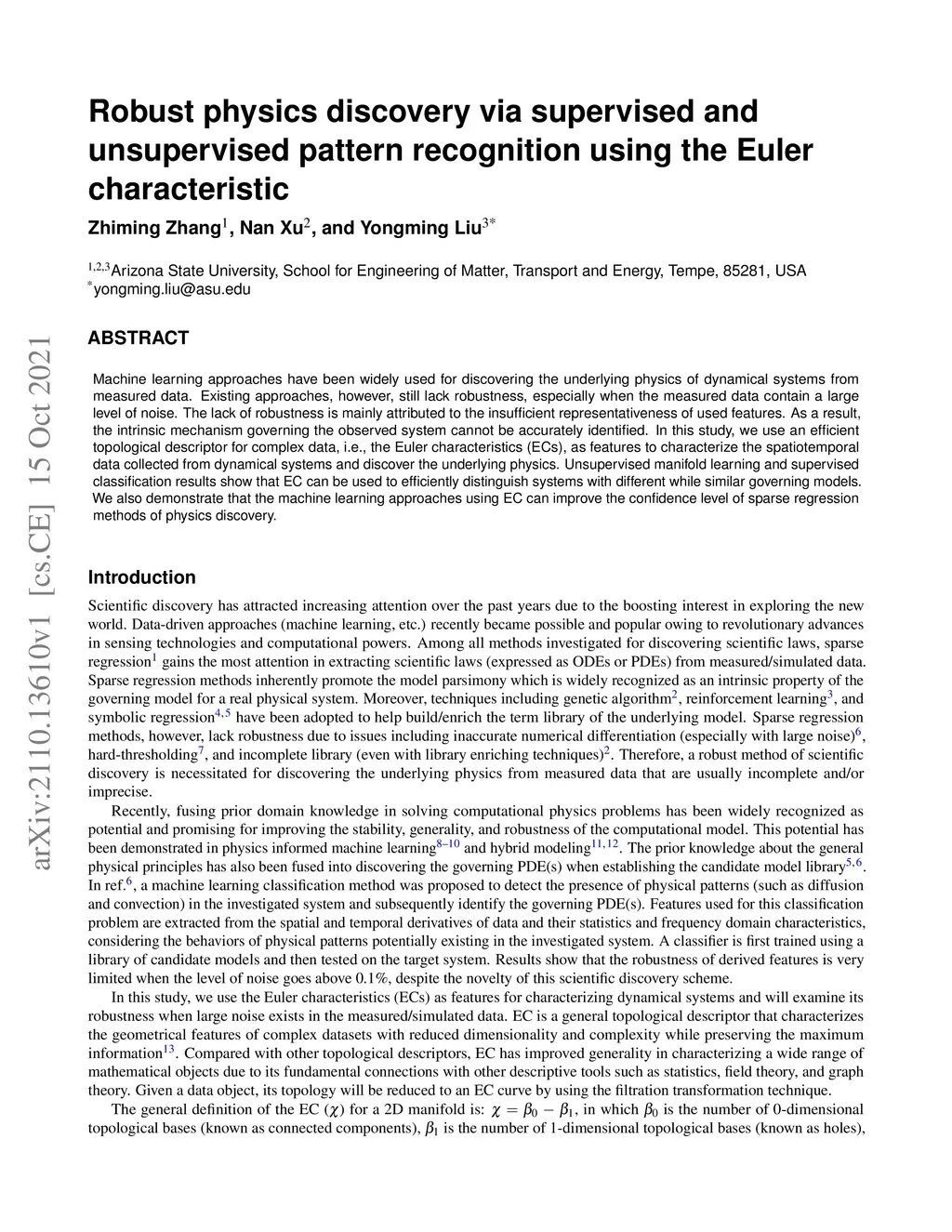 Machine learning approaches have been widely used for discovering the underlying physics of dynamical systems from measured data. Existing approaches, however, still lack robustness, especially when the measured data contain a large level of noise. The lack of robustness is mainly attributed to the insufficient representativeness of used features. As a result, the intrinsic mechanism governing the observed system cannot be accurately identified. In this study, we use an efficient topological descriptor for complex data, i.e., the Euler characteristics (ECs), as features to characterize the spatiotemporal data collected from dynamical systems and discover the underlying physics. Unsupervised manifold learning and supervised classification results show that EC can be used to efficiently distinguish systems with different while similar governing models. We also demonstrate that the machine learning approaches using EC can improve the confidence level of sparse regression methods of physics discovery.