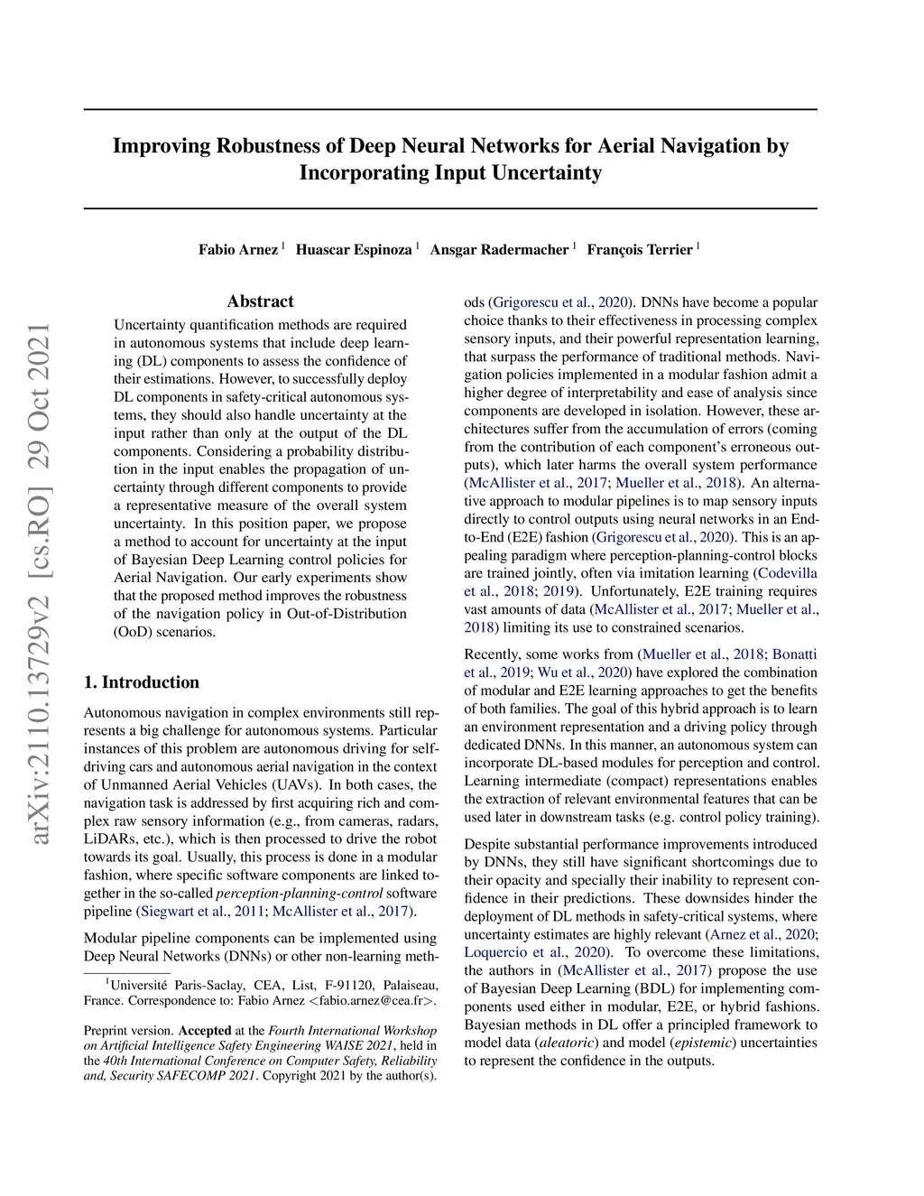 Uncertainty quantification methods are required in autonomous systems that include deep learning (DL) components to assess the confidence of their estimations. However, to successfully deploy DL components in safety-critical autonomous systems, they should also handle uncertainty at the input rather than only at the output of the DL components. Considering a probability distribution in the input enables the propagation of uncertainty through different components to provide a representative measure of the overall system uncertainty. In this position paper, we propose a method to account for uncertainty at the input of Bayesian Deep Learning control policies for Aerial Navigation. Our early experiments show that the proposed method improves the robustness of the navigation policy in Out-of-Distribution (OoD) scenarios.