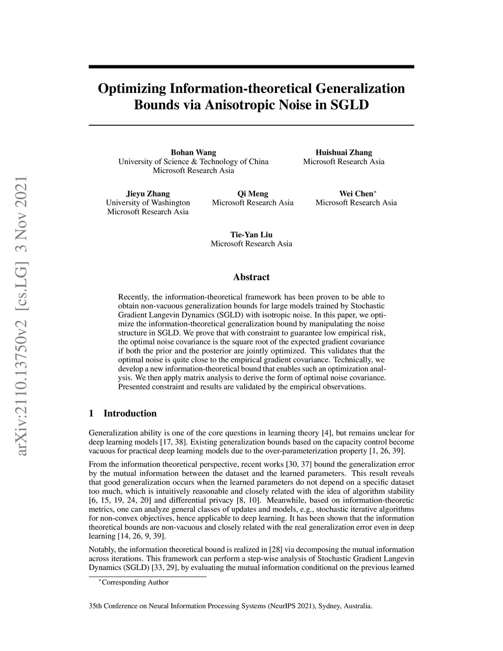 Recently, the information-theoretical framework has been proven to be able to obtain non-vacuous generalization bounds for large models trained by Stochastic Gradient Langevin Dynamics (SGLD) with isotropic noise. In this paper, we optimize the information-theoretical generalization bound by manipulating the noise structure in SGLD. We prove that with constraint to guarantee low empirical risk, the optimal noise covariance is the square root of the expected gradient covariance if both the prior and the posterior are jointly optimized. This validates that the optimal noise is quite close to the empirical gradient covariance. Technically, we develop a new information-theoretical bound that enables such an optimization analysis. We then apply matrix analysis to derive the form of optimal noise covariance. Presented constraint and results are validated by the empirical observations.