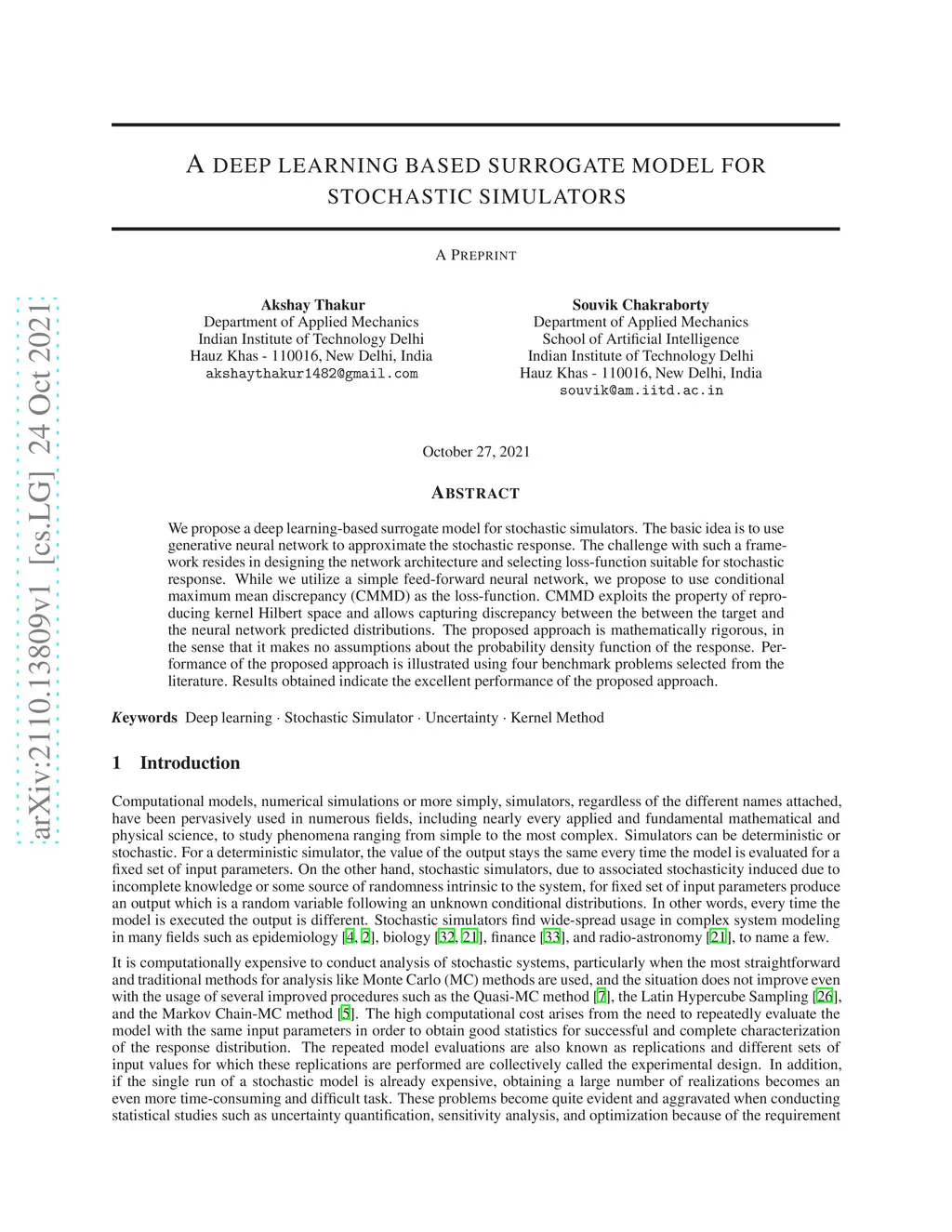 We propose a deep learning-based surrogate model for stochastic simulators. The basic idea is to use generative neural network to approximate the stochastic response. The challenge with such a framework resides in designing the network architecture and selecting loss-function suitable for stochastic response. While we utilize a simple feed-forward neural network, we propose to use conditional maximum mean discrepancy (CMMD) as the loss-function. CMMD exploits the property of reproducing kernel Hilbert space and allows capturing discrepancy between the between the target and the neural network predicted distributions. The proposed approach is mathematically rigorous, in the sense that it makes no assumptions about the probability density function of the response. Performance of the proposed approach is illustrated using four benchmark problems selected from the literature. Results obtained indicate the excellent performance of the proposed approach.