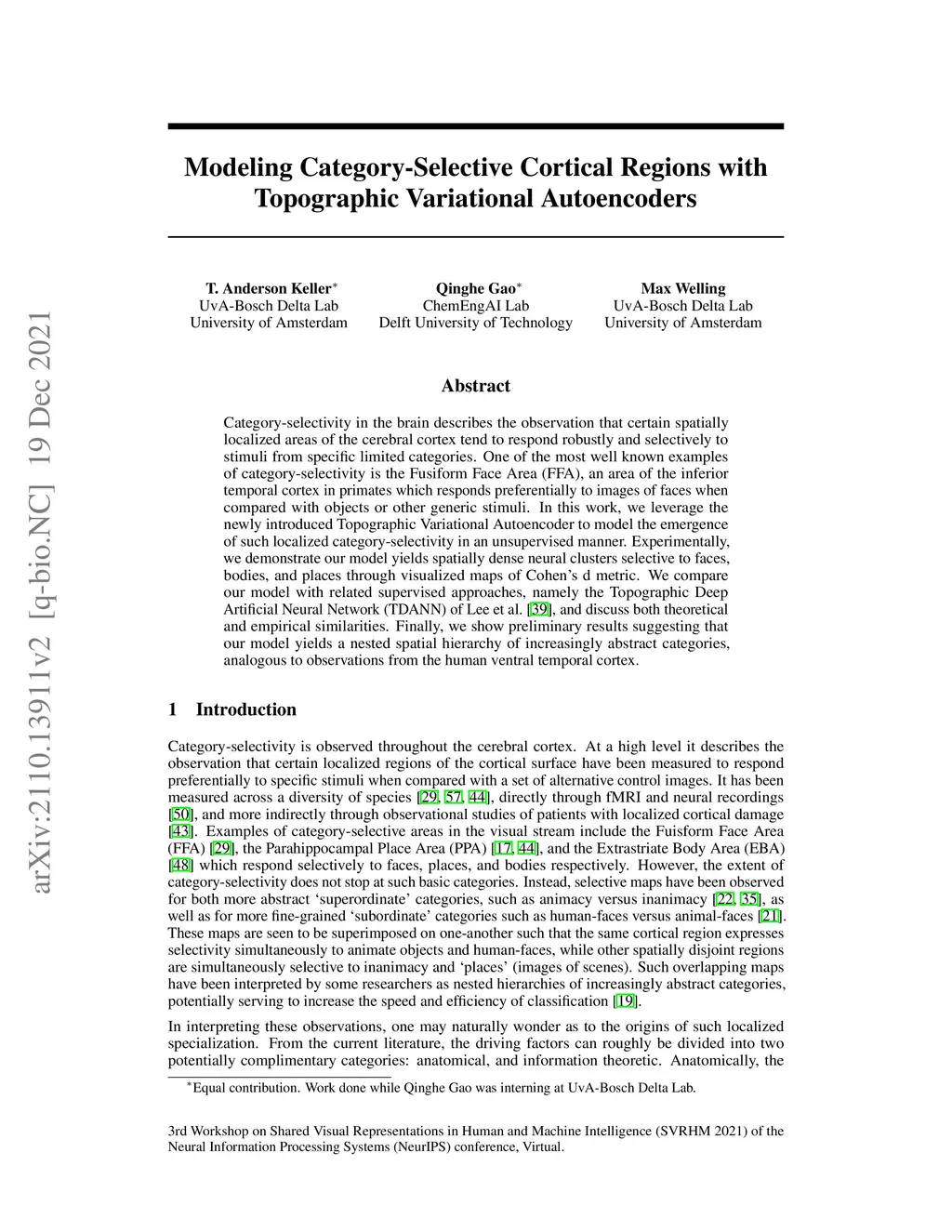 Category-selectivity in the brain describes the observation that certain spatially localized areas of the cerebral cortex tend to respond robustly and selectively to stimuli from specific limited categories. One of the most well known examples of category-selectivity is the Fusiform Face Area (FFA), an area of the inferior temporal cortex in primates which responds preferentially to images of faces when compared with objects or other generic stimuli. In this work, we leverage the newly introduced Topographic Variational Autoencoder to model the emergence of such localized category-selectivity in an unsupervised manner. Experimentally, we demonstrate our model yields spatially dense neural clusters selective to faces, bodies, and places through visualized maps of Cohen's d metric. We compare our model with related supervised approaches, namely the Topographic Deep Artificial Neural Network (TDANN) of Lee et al., and discuss both theoretical and empirical similarities. Finally, we show preliminary results suggesting that our model yields a nested spatial hierarchy of increasingly abstract categories, analogous to observations from the human ventral temporal cortex.