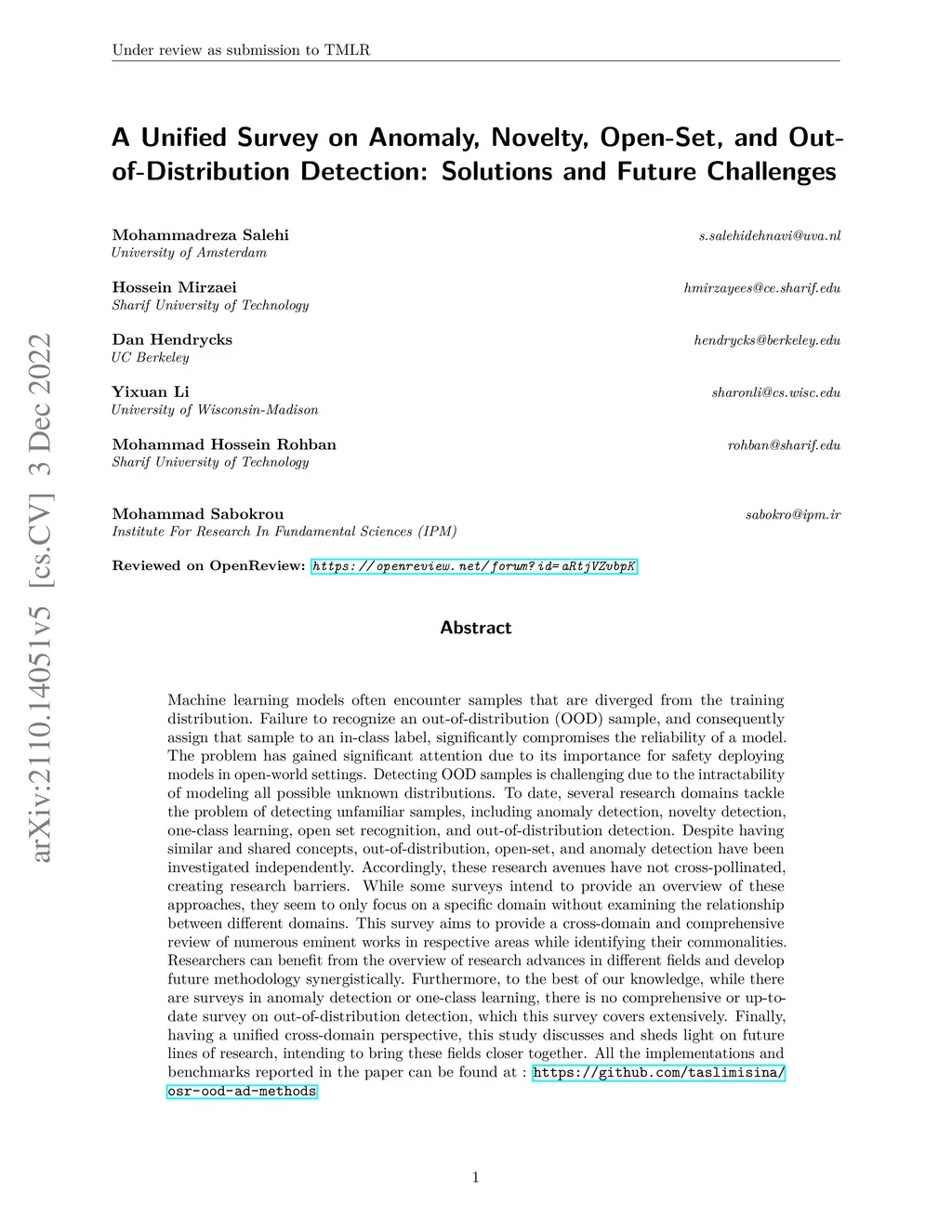 Machine learning models often encounter samples that are diverged from the training distribution. Failure to recognize an out-of-distribution (OOD) sample, and consequently assign that sample to an in-class label significantly compromises the reliability of a model. The problem has gained significant attention due to its importance for safety deploying models in open-world settings. Detecting OOD samples is challenging due to the intractability of modeling all possible unknown distributions. To date, several research domains tackle the problem of detecting unfamiliar samples, including anomaly detection, novelty detection, one-class learning, open set recognition, and out-of-distribution detection. Despite having similar and shared concepts, out-of-distribution, open-set, and anomaly detection have been investigated independently. Accordingly, these research avenues have not cross-pollinated, creating research barriers. While some surveys intend to provide an overview of these approaches, they seem to only focus on a specific domain without examining the relationship between different domains. This survey aims to provide a cross-domain and comprehensive review of numerous eminent works in respective areas while identifying their commonalities. Researchers can benefit from the overview of research advances in different fields and develop future methodology synergistically. Furthermore, to the best of our knowledge, while there are surveys in anomaly detection or one-class learning, there is no comprehensive or up-to-date survey on out-of-distribution detection, which our survey covers extensively. Finally, having a unified cross-domain perspective, we discuss and shed light on future lines of research, intending to bring these fields closer together.