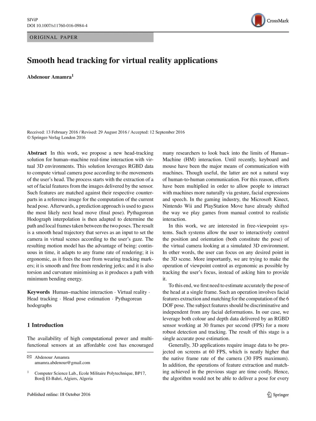 In this work, we propose a new head-tracking solution for human-machine real-time interaction with virtual 3D environments. This solution leverages RGBD data to compute virtual camera pose according to the movements of the user's head. The process starts with the extraction of a set of facial features from the images delivered by the sensor. Such features are matched against their respective counterparts in a reference image for the computation of the current head pose. Afterwards, a prediction approach is used to guess the most likely next head move (final pose). Pythagorean Hodograph interpolation is then adapted to determine the path and local frames taken between the two poses. The result is a smooth head trajectory that serves as an input to set the camera in virtual scenes according to the user's gaze. The resulting motion model has the advantage of being: continuous in time, it adapts to any frame rate of rendering; it is ergonomic, as it frees the user from wearing tracking markers; it is smooth and free from rendering jerks; and it is also torsion and curvature minimizing as it produces a path with minimum bending energy.
