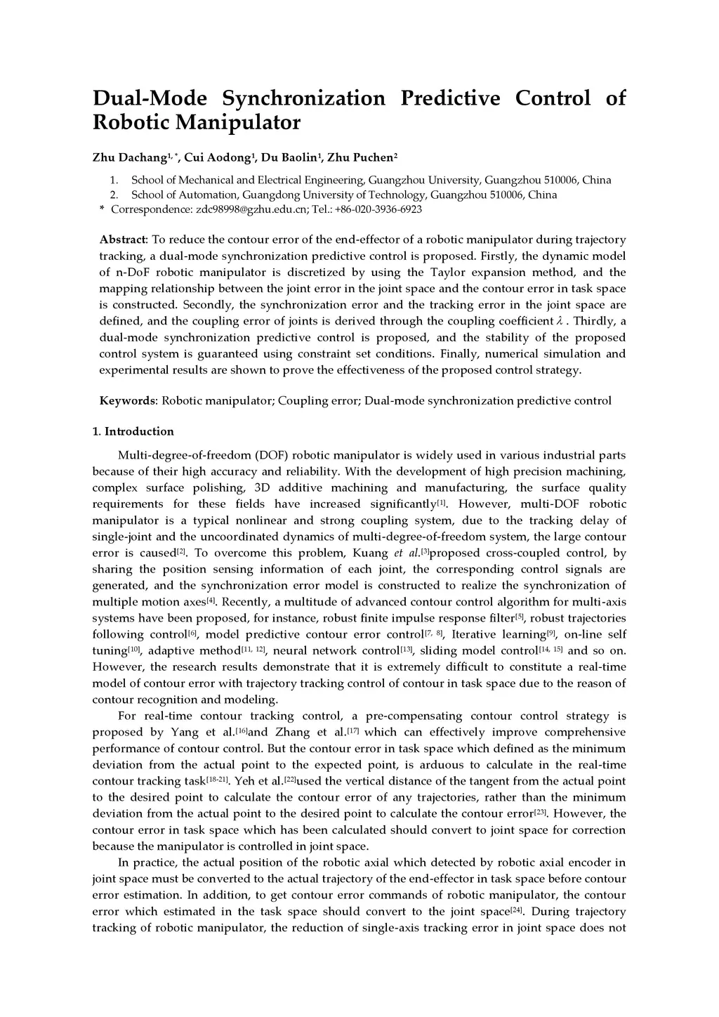 To reduce the contour error of the end-effector of a robotic manipulator during trajectory tracking, a dual-mode synchronization predictive control is proposed. Firstly, the dynamic model of n-DoF robotic manipulator is discretized by using the Taylor expansion method, and the mapping relationship between the joint error in the joint space and the contour error in task space is constructed. Secondly, the synchronization error and the tracking error in the joint space are defined, and the coupling error of joints is derived through the coupling coefficient . Thirdly, a dual-mode synchronization predictive control is proposed, and the stability of the proposed control system is guaranteed using constraint set conditions. Finally, numerical simulation and experimental results are shown to prove the effectiveness of the proposed control strategy.
