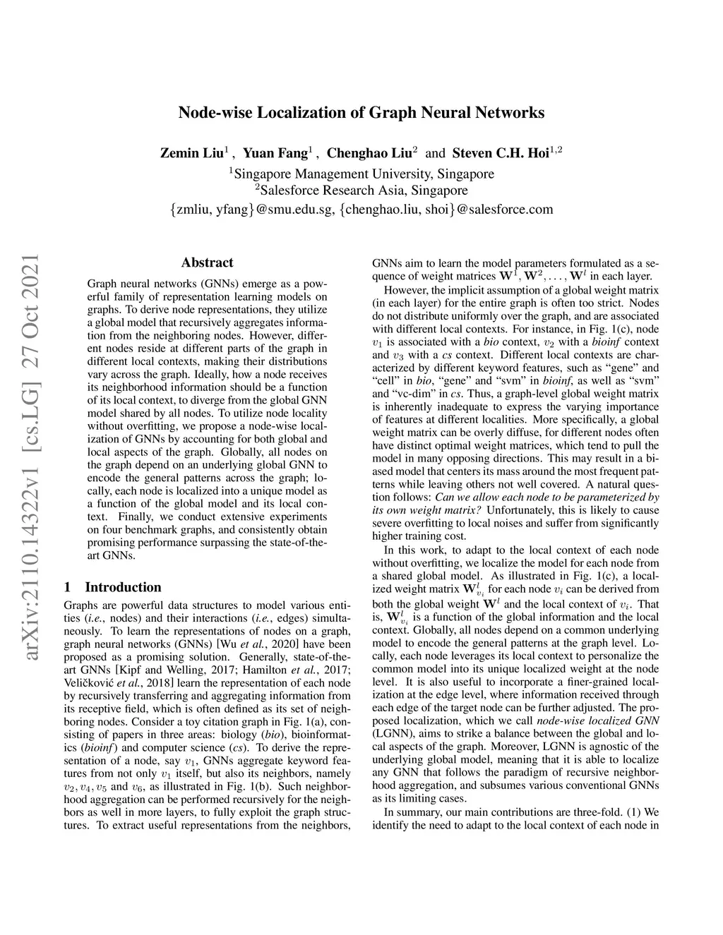 Graph neural networks (GNNs) emerge as a powerful family of representation learning models on graphs. To derive node representations, they utilize a global model that recursively aggregates information from the neighboring nodes. However, different nodes reside at different parts of the graph in different local contexts, making their distributions vary across the graph. Ideally, how a node receives its neighborhood information should be a function of its local context, to diverge from the global GNN model shared by all nodes. To utilize node locality without overfitting, we propose a node-wise localization of GNNs by accounting for both global and local aspects of the graph. Globally, all nodes on the graph depend on an underlying global GNN to encode the general patterns across the graph; locally, each node is localized into a unique model as a function of the global model and its local context. Finally, we conduct extensive experiments on four benchmark graphs, and consistently obtain promising performance surpassing the state-of-the-art GNNs.