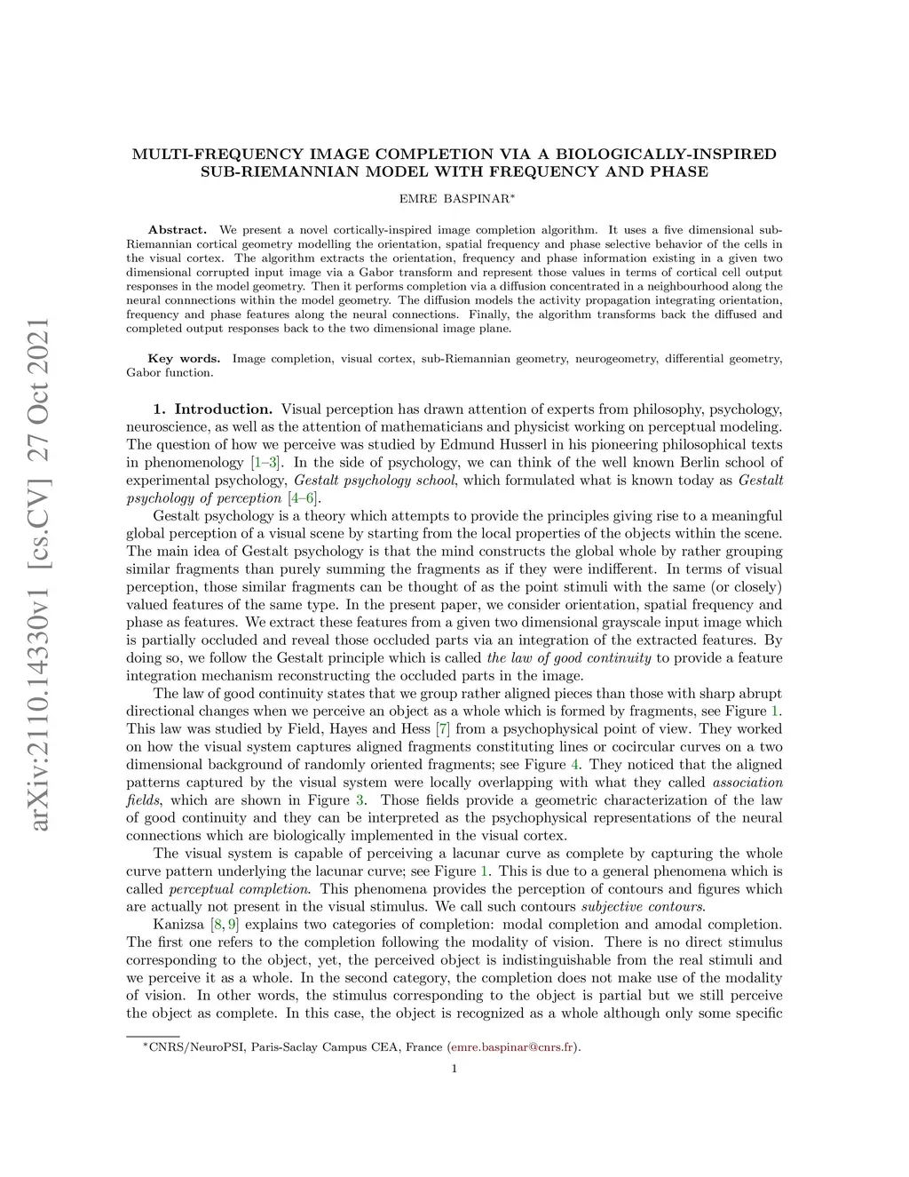 We present a novel cortically-inspired image completion algorithm. It uses a five dimensional sub-Riemannian cortical geometry modelling the orientation, spatial frequency and phase selective behavior of the cells in the visual cortex. The algorithm extracts the orientation, frequency and phase information existing in a given two dimensional corrupted input image via a Gabor transform and represent those values in terms of cortical cell output responses in the model geometry. Then it performs completion via a diffusion concentrated in a neighbourhood along the neural connections within the model geometry. The diffusion models the activity propagation integrating orientation, frequency and phase features along the neural connections. Finally, the algorithm transforms back the diffused and completed output responses back to the two dimensional image plane.
