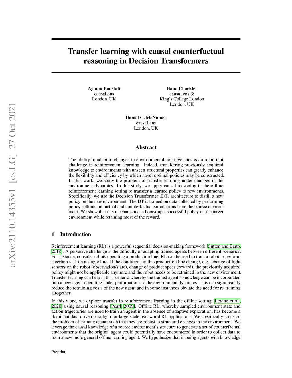 Transfer learning with causal counterfactual reasoning in Decision