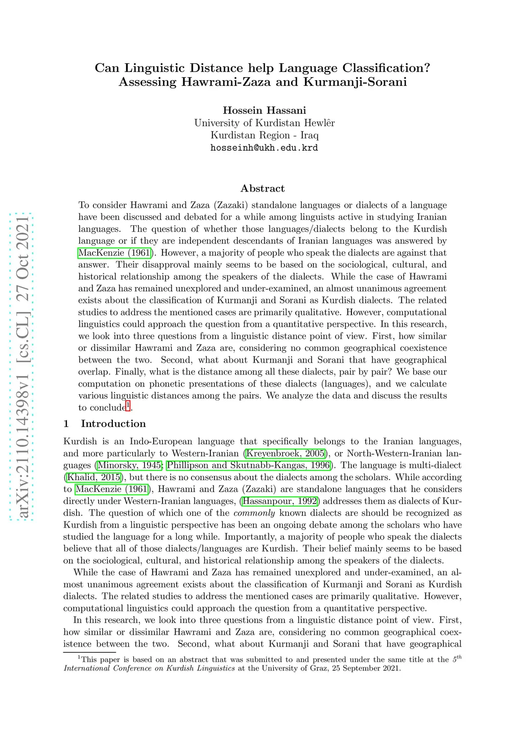 To consider Hawrami and Zaza (Zazaki) standalone languages or dialects of a language have been discussed and debated for a while among linguists active in studying Iranian languages. The question of whether those languages/dialects belong to the Kurdish language or if they are independent descendants of Iranian languages was answered by MacKenzie (1961). However, a majority of people who speak the dialects are against that answer. Their disapproval mainly seems to be based on the sociological, cultural, and historical relationship among the speakers of the dialects. While the case of Hawrami and Zaza has remained unexplored and under-examined, an almost unanimous agreement exists about the classification of Kurmanji and Sorani as Kurdish dialects. The related studies to address the mentioned cases are primarily qualitative. However, computational linguistics could approach the question from a quantitative perspective. In this research, we look into three questions from a linguistic distance point of view. First, how similar or dissimilar Hawrami and Zaza are, considering no common geographical coexistence between the two. Second, what about Kurmanji and Sorani that have geographical overlap. Finally, what is the distance among all these dialects, pair by pair? We base our computation on phonetic presentations of these dialects (languages), and we calculate various linguistic distances among the pairs. We analyze the data and discuss the results to conclude.