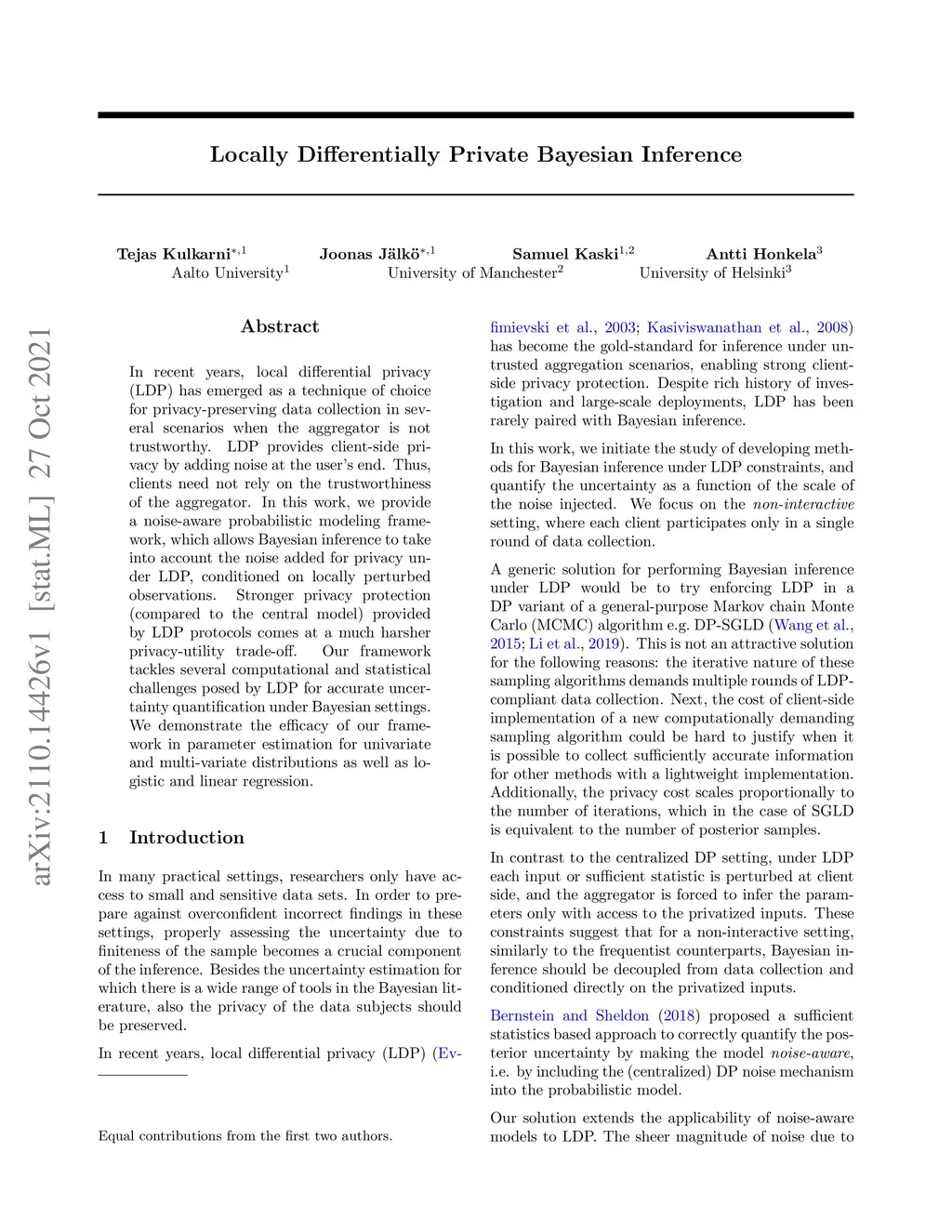 In recent years, local differential privacy (LDP) has emerged as a technique of choice for privacy-preserving data collection in several scenarios when the aggregator is not trustworthy. LDP provides client-side privacy by adding noise at the user's end. Thus, clients need not rely on the trustworthiness of the aggregator. In this work, we provide a noise-aware probabilistic modeling framework, which allows Bayesian inference to take into account the noise added for privacy under LDP, conditioned on locally perturbed observations. Stronger privacy protection (compared to the central model) provided by LDP protocols comes at a much harsher privacy-utility trade-off. Our framework tackles several computational and statistical challenges posed by LDP for accurate uncertainty quantification under Bayesian settings. We demonstrate the efficacy of our framework in parameter estimation for univariate and multi-variate distributions as well as logistic and linear regression.