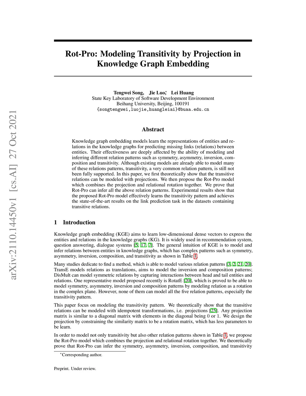 Rot-Pro: Modeling Transitivity by Projection in Knowledge Graph