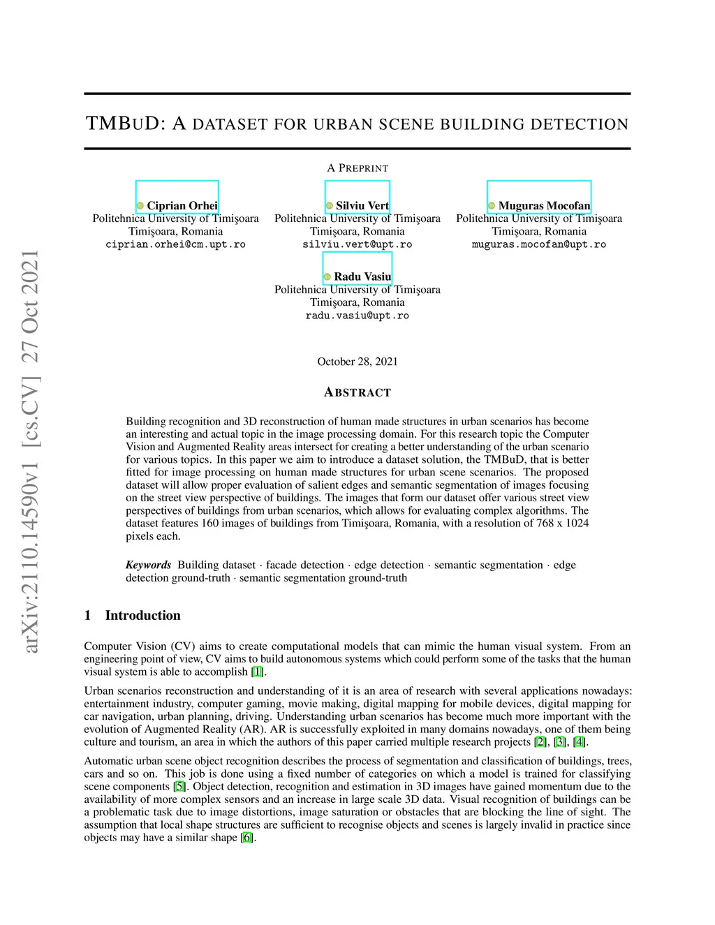 Building recognition and 3D reconstruction of human made structures in urban scenarios has become an interesting and actual topic in the image processing domain. For this research topic the Computer Vision and Augmented Reality areas intersect for creating a better understanding of the urban scenario for various topics. In this paper we aim to introduce a dataset solution, the TMBuD, that is better fitted for image processing on human made structures for urban scene scenarios. The proposed dataset will allow proper evaluation of salient edges and semantic segmentation of images focusing on the street view perspective of buildings. The images that form our dataset offer various street view perspectives of buildings from urban scenarios, which allows for evaluating complex algorithms. The dataset features 160 images of buildings from Timisoara, Romania, with a resolution of 768 x 1024 pixels each.