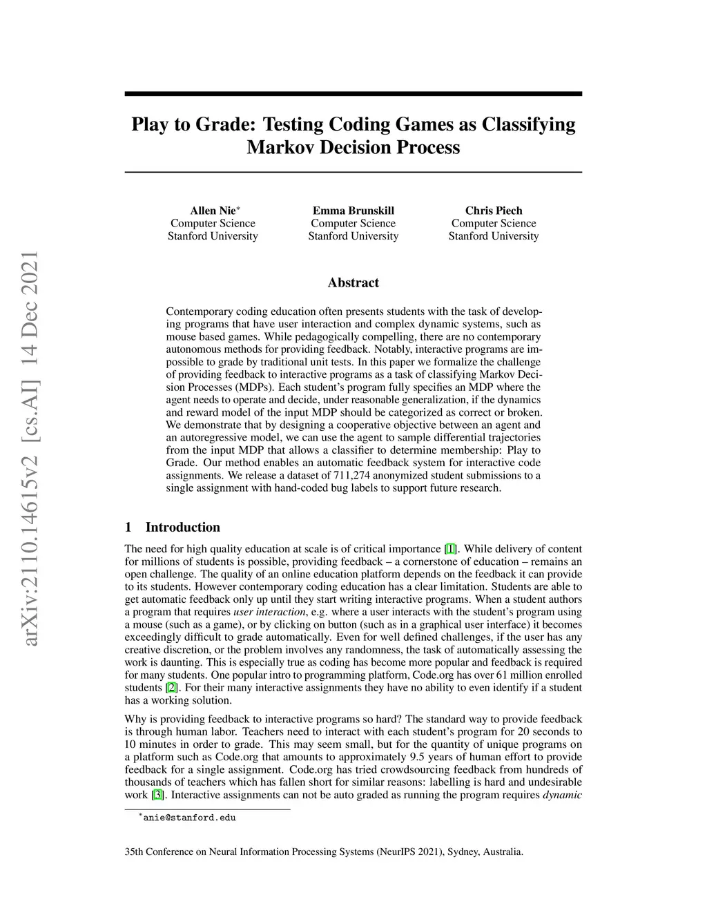 Play to Grade: Testing Coding Games as Classifying Markov Decision