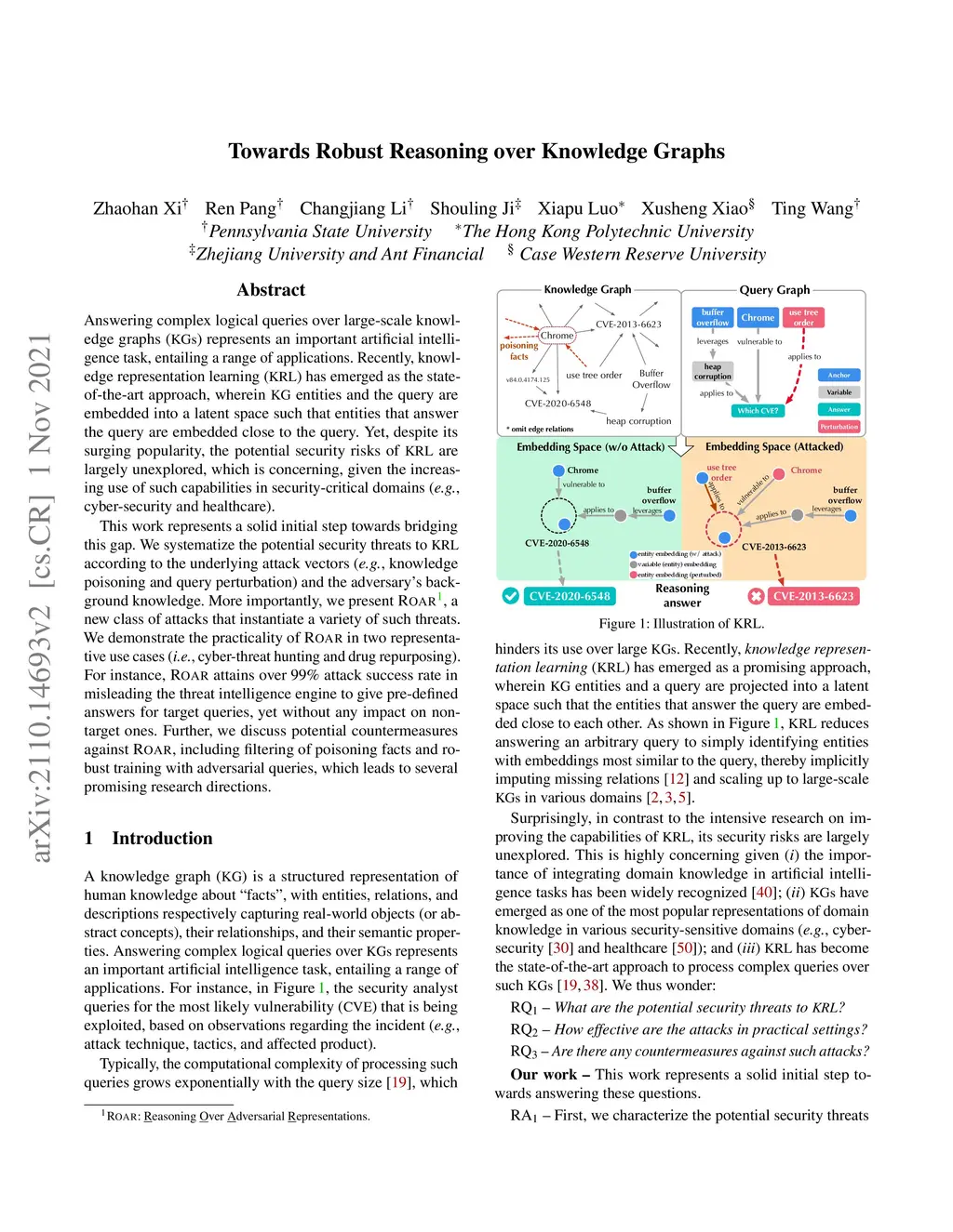 Answering complex logical queries over large-scale knowledge graphs (KGs) represents an important artificial intelligence task, entailing a range of applications. Recently, knowledge representation learning (KRL) has emerged as the state-of-the-art approach, wherein KG entities and the query are embedded into a latent space such that entities that answer the query are embedded close to the query. Yet, despite its surging popularity, the potential security risks of KRL are largely unexplored, which is concerning, given the increasing use of such capabilities in security-critical domains (e.g., cyber-security and healthcare). This work represents a solid initial step towards bridging this gap. We systematize the potential security threats to KRL according to the underlying attack vectors (e.g., knowledge poisoning and query perturbation) and the adversary's background knowledge. More importantly, we present ROAR(Reasoning Over Adversarial Representations), a new class of attacks that instantiate a variety of such threats. We demonstrate the practicality of ROAR in two representative use cases (i.e., cyber-threat hunting and drug repurposing). For instance, ROAR attains over 99% attack success rate in misleading the threat intelligence engine to give pre-defined answers for target queries, yet without any impact on non-target ones. Further, we discuss potential countermeasures against ROAR, including filtering of poisoning facts and robust training with adversarial queries, which leads to several promising research directions.