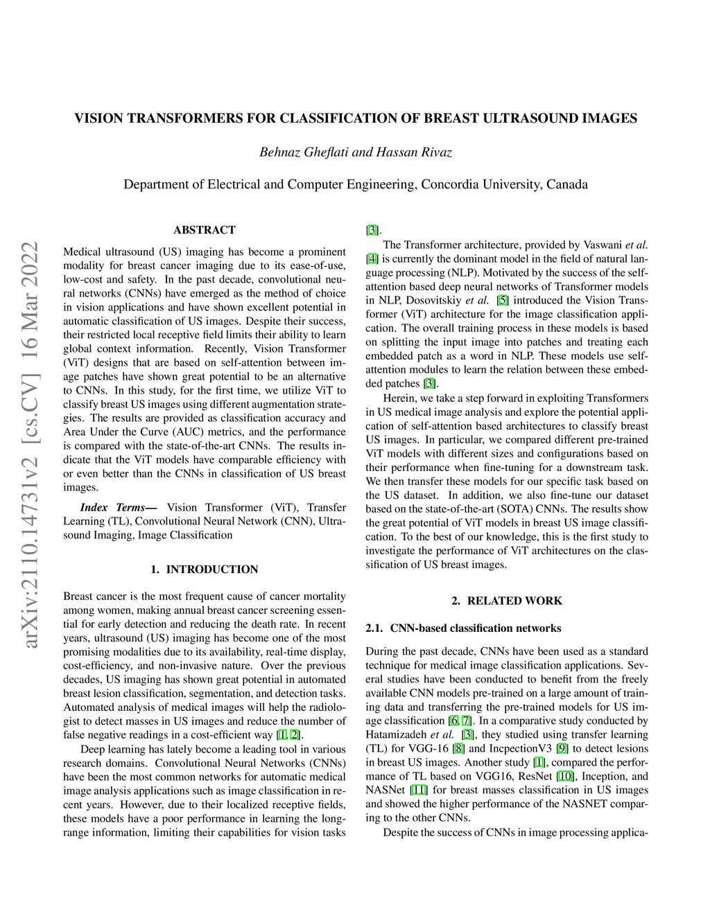 Vision Transformer for Classification of Breast Ultrasound Images