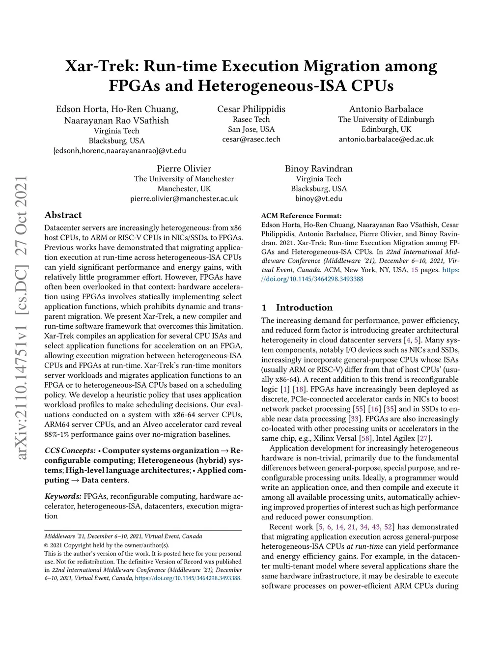 Xar-Trek: Run-time Execution Migration among FPGAs and Heterogeneous-ISA
