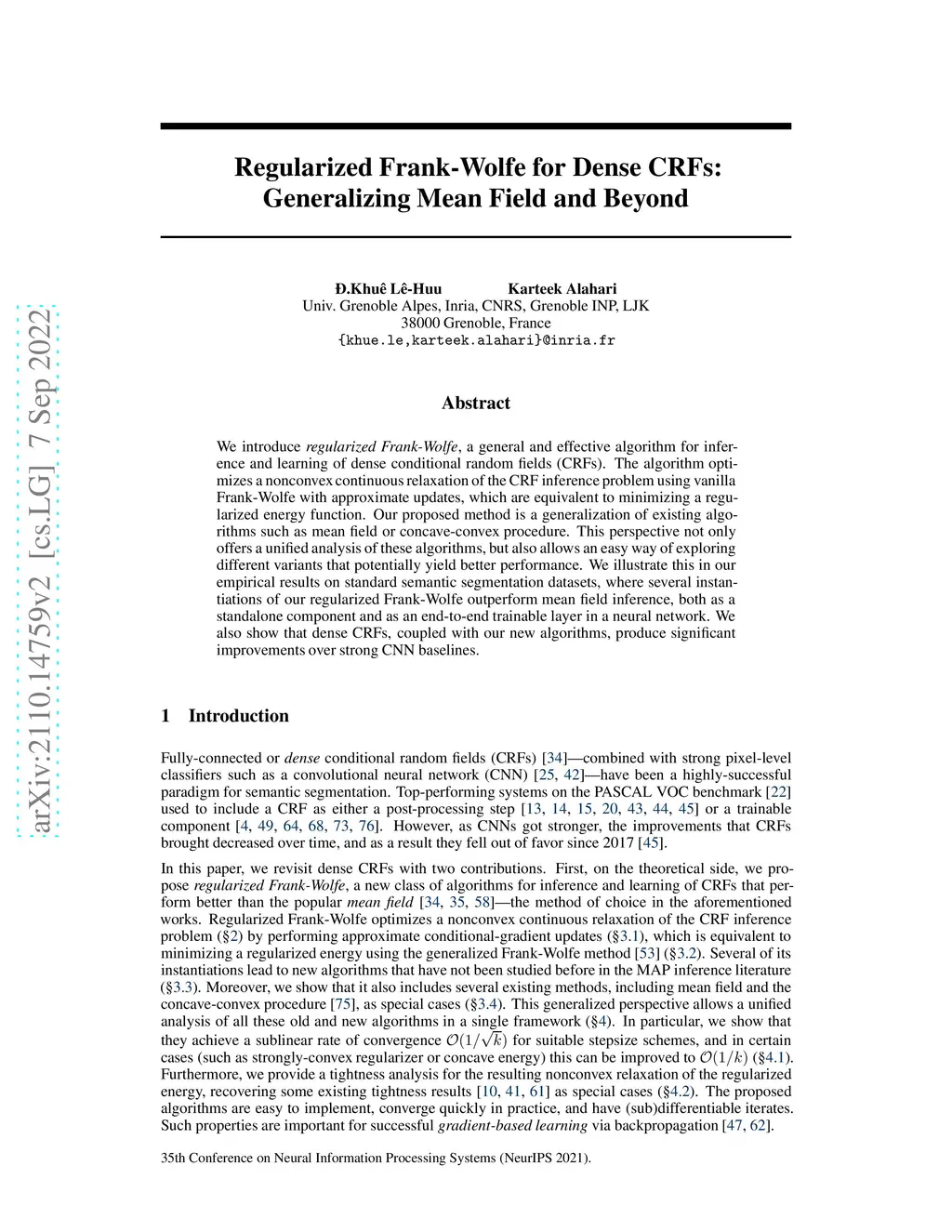 We introduce regularized Frank-Wolfe, a general and effective algorithm for inference and learning of dense conditional random fields (CRFs). The algorithm optimizes a nonconvex continuous relaxation of the CRF inference problem using vanilla Frank-Wolfe with approximate updates, which are equivalent to minimizing a regularized energy function. Our proposed method is a generalization of existing algorithms such as mean field or concave-convex procedure. This perspective not only offers a unified analysis of these algorithms, but also allows an easy way of exploring different variants that potentially yield better performance. We illustrate this in our empirical results on standard semantic segmentation datasets, where several instantiations of our regularized Frank-Wolfe outperform mean field inference, both as a standalone component and as an end-to-end trainable layer in a neural network. We also show that dense CRFs, coupled with our new algorithms, produce significant improvements over strong CNN baselines.