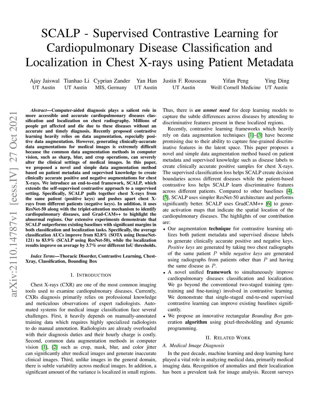 Computer-aided diagnosis plays a salient role in more accessible and accurate cardiopulmonary diseases classification and localization on chest radiography. Millions of people get affected and die due to these diseases without an accurate and timely diagnosis. Recently proposed contrastive learning heavily relies on data augmentation, especially positive data augmentation. However, generating clinically-accurate data augmentations for medical images is extremely difficult because the common data augmentation methods in computer vision, such as sharp, blur, and crop operations, can severely alter the clinical settings of medical images. In this paper, we proposed a novel and simple data augmentation method based on patient metadata and supervised knowledge to create clinically accurate positive and negative augmentations for chest X-rays. We introduce an end-to-end framework, SCALP, which extends the self-supervised contrastive approach to a supervised setting. Specifically, SCALP pulls together chest X-rays from the same patient (positive keys) and pushes apart chest X-rays from different patients (negative keys). In addition, it uses ResNet-50 along with the triplet-attention mechanism to identify cardiopulmonary diseases, and Grad-CAM++ to highlight the abnormal regions. Our extensive experiments demonstrate that SCALP outperforms existing baselines with significant margins in both classification and localization tasks. Specifically, the average classification AUCs improve from 82.8% (SOTA using DenseNet-121) to 83.9% (SCALP using ResNet-50), while the localization results improve on average by 3.7% over different IoU thresholds.