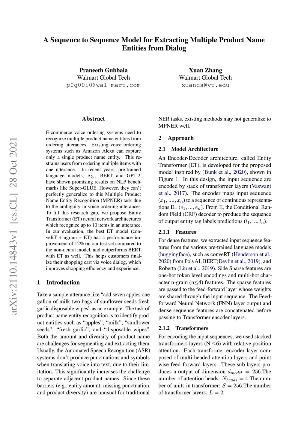 E-commerce voice ordering systems need to recognize multiple product name entities from ordering utterances. Existing voice ordering systems such as Amazon Alexa can capture only a single product name entity. This restrains users from ordering multiple items with one utterance. In recent years, pre-trained language models, e.g., BERT and GPT-2, have shown promising results on NLP benchmarks like Super-GLUE. However, they can't perfectly generalize to this Multiple Product Name Entity Recognition (MPNER) task due to the ambiguity in voice ordering utterances. To fill this research gap, we propose Entity Transformer (ET) neural network architectures which recognize up to 10 items in an utterance. In our evaluation, the best ET model (conveRT + ngram + ET) has a performance improvement of 12% on our test set compared to the non-neural model, and outperforms BERT with ET as well. This helps customers finalize their shopping cart via voice dialog, which improves shopping efficiency and experience.