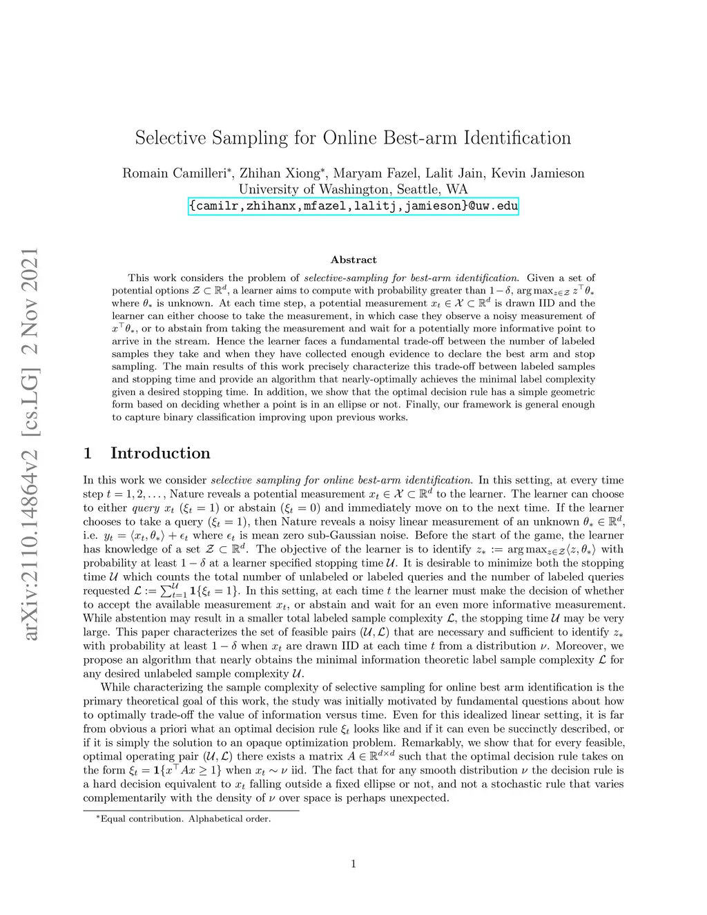 This work considers the problem of selective-sampling for best-arm identification. Given a set of potential options , a learner aims to compute with probability greater than , where is unknown. At each time step, a potential measurement is drawn IID and the learner can either choose to take the measurement, in which case they observe a noisy measurement of , or to abstain from taking the measurement and wait for a potentially more informative point to arrive in the stream. Hence the learner faces a fundamental trade-off between the number of labeled samples they take and when they have collected enough evidence to declare the best arm and stop sampling. The main results of this work precisely characterize this trade-off between labeled samples and stopping time and provide an algorithm that nearly-optimally achieves the minimal label complexity given a desired stopping time. In addition, we show that the optimal decision rule has a simple geometric form based on deciding whether a point is in an ellipse or not. Finally, our framework is general enough to capture binary classification improving upon previous works.