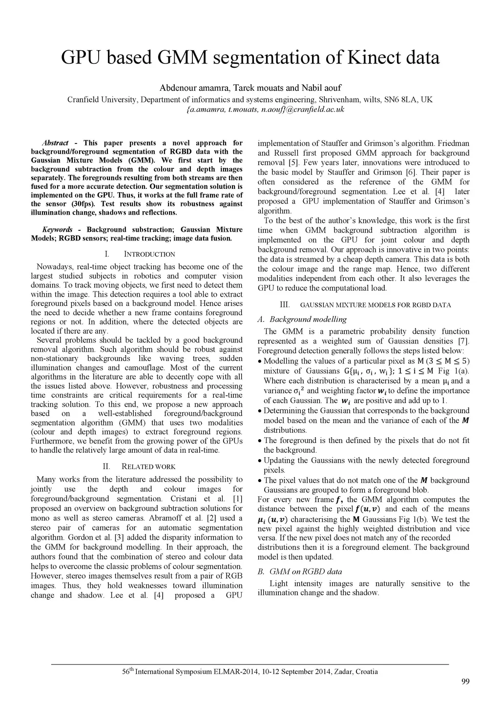 This paper presents a novel approach for background/foreground segmentation of RGBD data with the Gaussian Mixture Models (GMM). We first start by the background subtraction from the colour and depth images separately. The foregrounds resulting from both streams are then fused for a more accurate detection. Our segmentation solution is implemented on the GPU. Thus, it works at the full frame rate of the sensor (30fps). Test results show its robustness against illumination change, shadows and reflections.