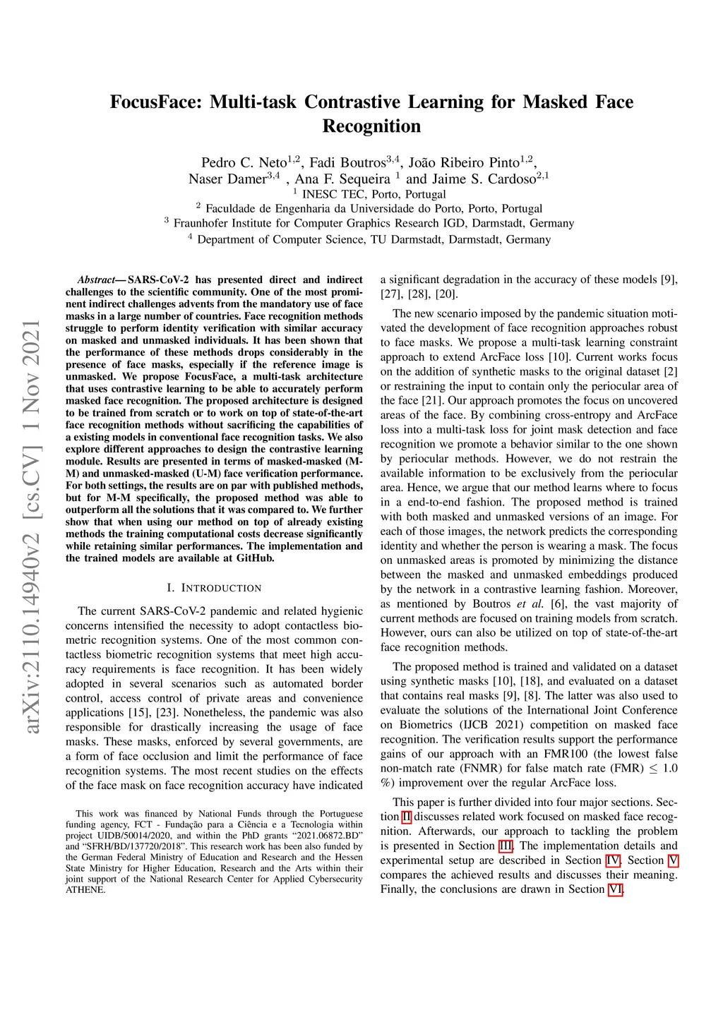 FocusFace: Multi-task Contrastive Learning for Masked Face Recognition