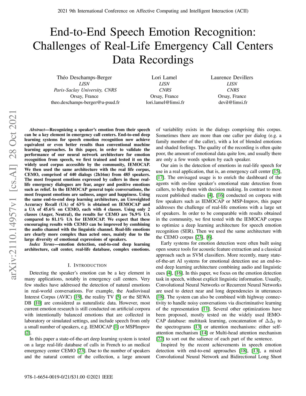 Recognizing a speaker's emotion from their speech can be a key element in emergency call centers. End-to-end deep learning systems for speech emotion recognition now achieve equivalent or even better results than conventional machine learning approaches. In this paper, in order to validate the performance of our neural network architecture for emotion recognition from speech, we first trained and tested it on the widely used corpus accessible by the community, IEMOCAP. We then used the same architecture as the real life corpus, CEMO, composed of 440 dialogs (2h16m) from 485 speakers. The most frequent emotions expressed by callers in these real life emergency dialogues are fear, anger and positive emotions such as relief. In the IEMOCAP general topic conversations, the most frequent emotions are sadness, anger and happiness. Using the same end-to-end deep learning architecture, an Unweighted Accuracy Recall (UA) of 63% is obtained on IEMOCAP and a UA of 45.6% on CEMO, each with 4 classes. Using only 2 classes (Anger, Neutral), the results for CEMO are 76.9% UA compared to 81.1% UA for IEMOCAP. We expect that these encouraging results with CEMO can be improved by combining the audio channel with the linguistic channel. Real-life emotions are clearly more complex than acted ones, mainly due to the large diversity of emotional expressions of speakers. Index Terms-emotion detection, end-to-end deep learning architecture, call center, real-life database, complex emotions.