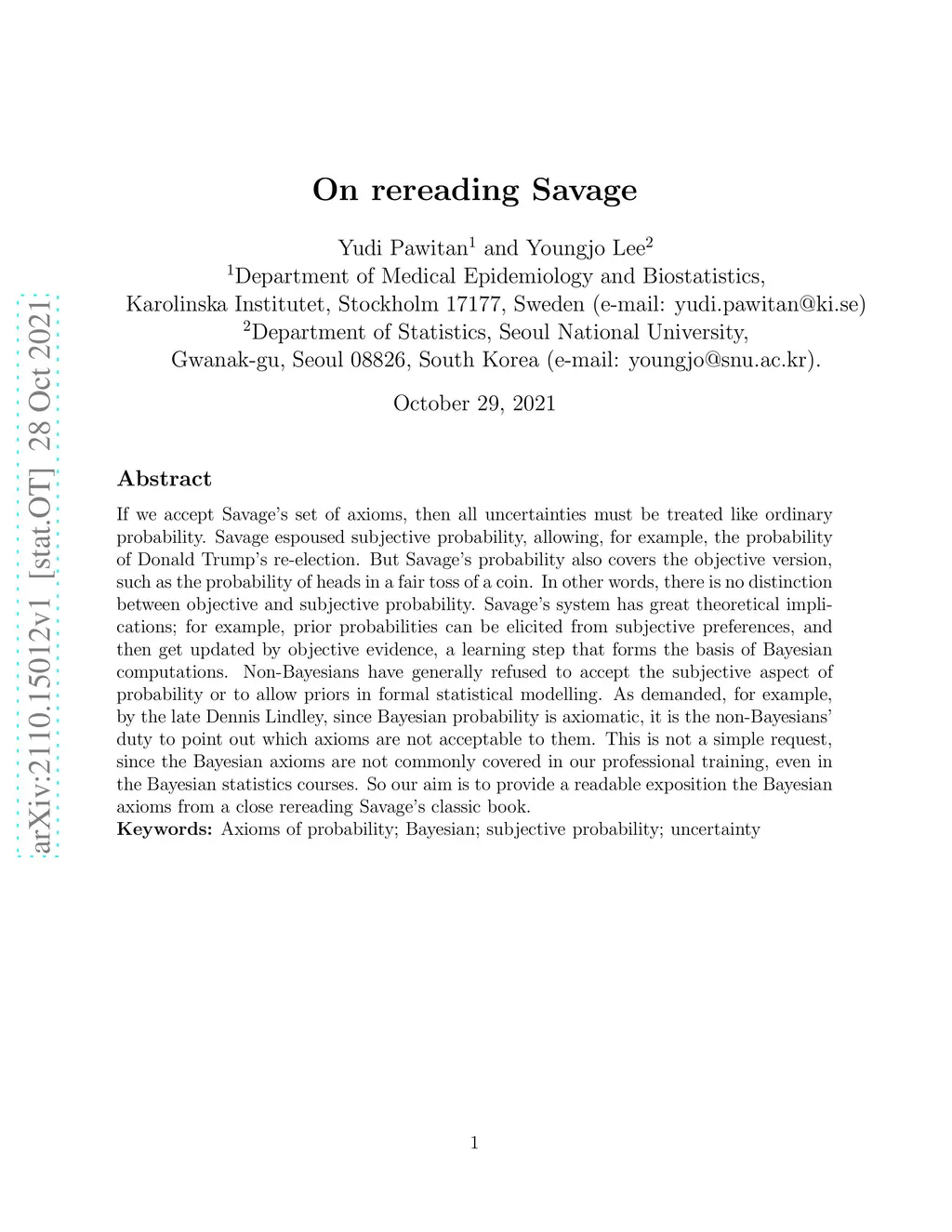 If we accept Savage's set of axioms, then all uncertainties must be treated like ordinary probability. Savage espoused subjective probability, allowing, for example, the probability of Donald Trump's re-election. But Savage's probability also covers the objective version, such as the probability of heads in a fair toss of a coin. In other words, there is no distinction between objective and subjective probability. Savage's system has great theoretical implications; for example, prior probabilities can be elicited from subjective preferences, and then get updated by objective evidence, a learning step that forms the basis of Bayesian computations. Non-Bayesians have generally refused to accept the subjective aspect of probability or to allow priors in formal statistical modelling. As demanded, for example, by the late Dennis Lindley, since Bayesian probability is axiomatic, it is the non-Bayesians' duty to point out which axioms are not acceptable to them. This is not a simple request, since the Bayesian axioms are not commonly covered in our professional training, even in the Bayesian statistics courses. So our aim is to provide a readable exposition the Bayesian axioms from a close rereading Savage's classic book.