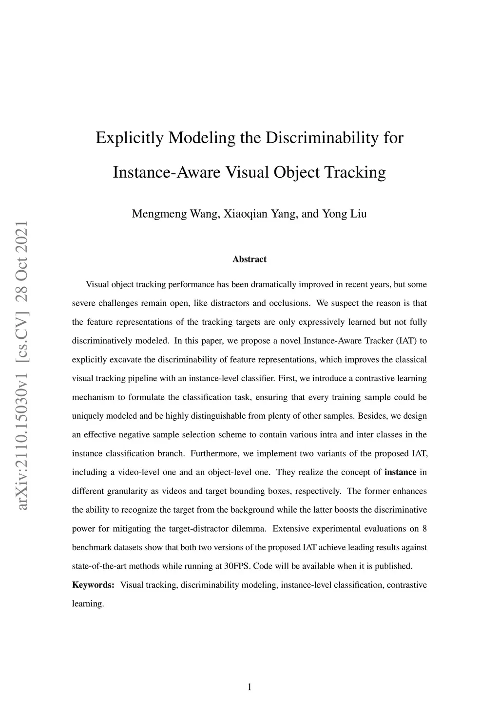 Visual object tracking performance has been dramatically improved in recent years, but some severe challenges remain open, like distractors and occlusions. We suspect the reason is that the feature representations of the tracking targets are only expressively learned but not fully discriminatively modeled. In this paper, we propose a novel Instance-Aware Tracker (IAT) to explicitly excavate the discriminability of feature representations, which improves the classical visual tracking pipeline with an instance-level classifier. First, we introduce a contrastive learning mechanism to formulate the classification task, ensuring that every training sample could be uniquely modeled and be highly distinguishable from plenty of other samples. Besides, we design an effective negative sample selection scheme to contain various intra and inter classes in the instance classification branch. Furthermore, we implement two variants of the proposed IAT, including a video-level one and an object-level one. They realize the concept of \textbf{instance} in different granularity as videos and target bounding boxes, respectively. The former enhances the ability to recognize the target from the background while the latter boosts the discriminative power for mitigating the target-distractor dilemma. Extensive experimental evaluations on 8 benchmark datasets show that both two versions of the proposed IAT achieve leading results against state-of-the-art methods while running at 30FPS. Code will be available when it is published.