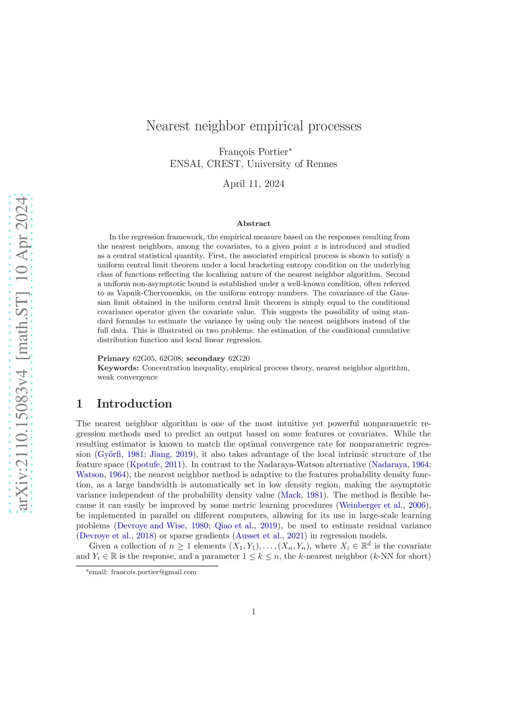 In the regression framework, the empirical measure based on the responses resulting from the nearest neighbors, among the covariates, to a given point is introduced and studied as a central statistical quantity. First, the associated empirical process is shown to satisfy a uniform central limit theorem under a local bracketing entropy condition on the underlying class of functions reflecting the localizing nature of the nearest neighbor algorithm. Second a uniform non-asymptotic bound is established under a well-known condition, often referred to as Vapnik-Chervonenkis, on the uniform entropy numbers. The covariance of the Gaussian limit obtained in the uniform central limit theorem is simply equal to the conditional covariance operator given the covariate value. This suggests the possibility of using standard formulas to estimate the variance by using only the nearest neighbors instead of the full data. This is illustrated on two problems: the estimation of the conditional cumulative distribution function and local linear regression.
